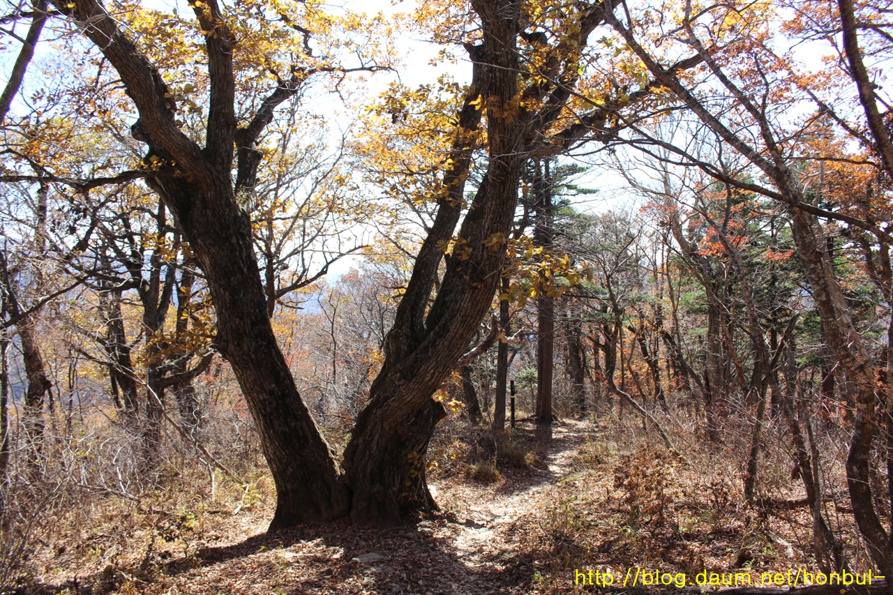 정상에서 간단하게 식사를 마치고 상왕봉 가는 길에 만나 참나무이다.