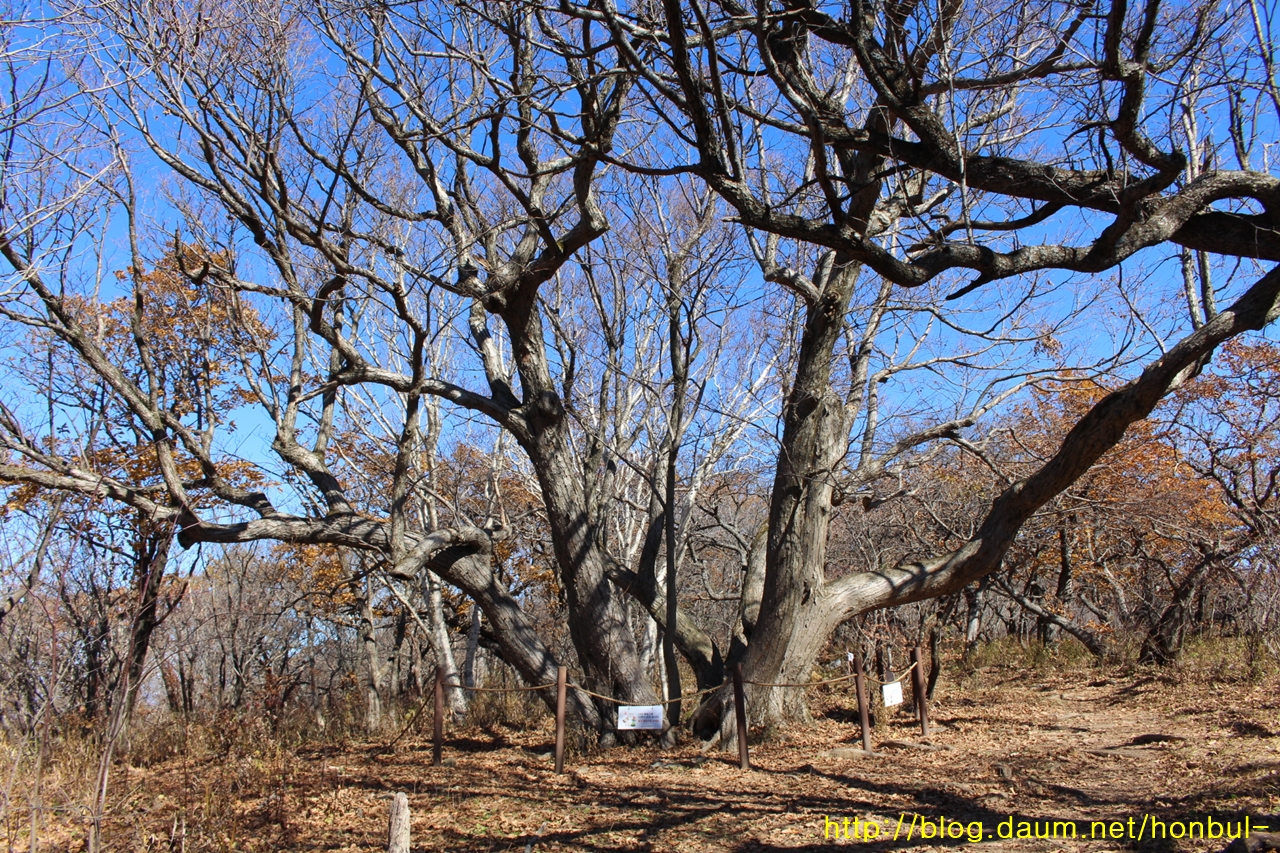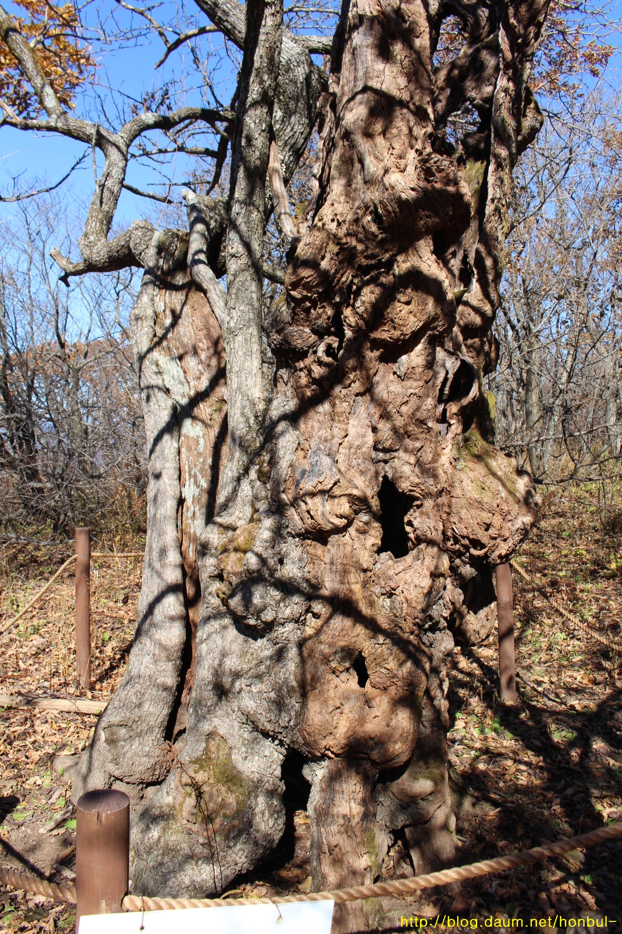 이 나무는 울퉁불퉁하게 생긴 특이한 참나무로 같은 나무가 줄기가 갈린 것이다.