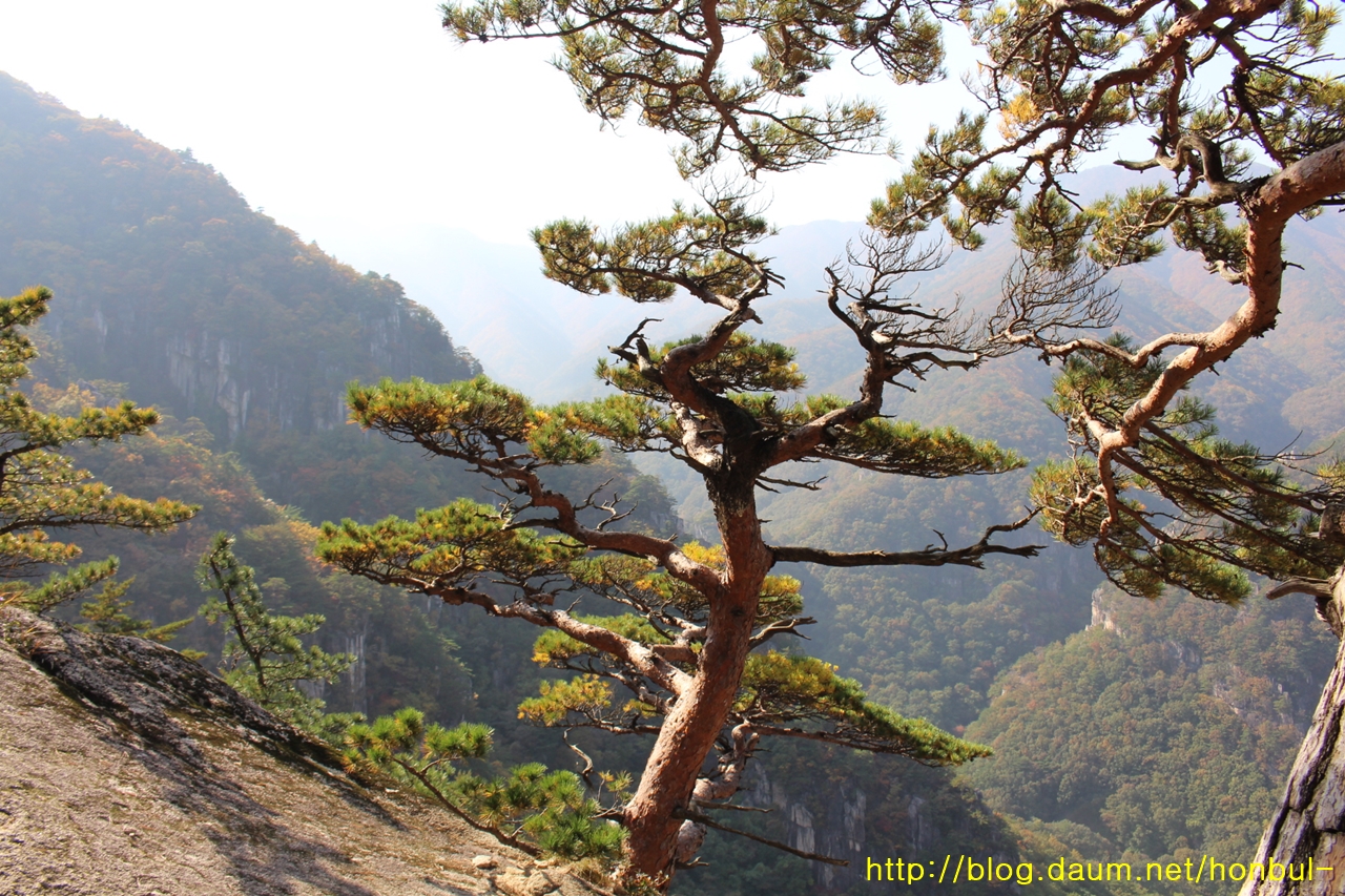 이 소나무의 자태가 우아한데, 등산객의 편의를 위해 이리저리 잘렸다.
