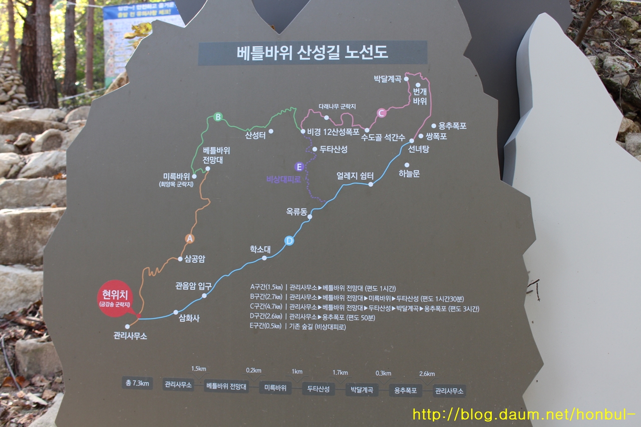 지난번에 베틀봉 정상까지 올라갔으나 오늘은 생략하고 바로 이 길을 따라 거리와 고된 걸음을 줄인다.