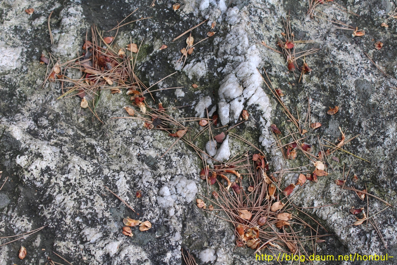 이 바위엔 잣 열매인지 솔방울 열매인지 모를 씨를 빼먹은 흔적이 보인다.