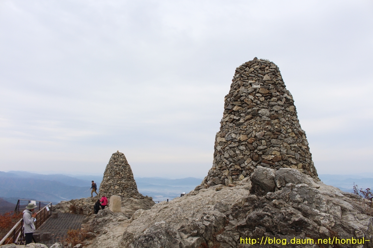 납작한 정상에 사이좋게 쌓여있는 세 개의 돌탑 주위에서 대부분의 등산객들은 휴식과 식사를 한다.