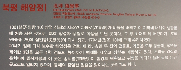 지금의 해암정(海岩亭)은 본래 건물이 소실된 후 조선 중종 25년(1530년)에 어촌(漁村) 심언광이 중건하고,