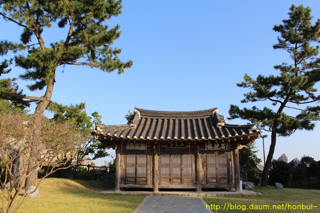 뒤로 지붕보다 조금 높은 바위산이 있어 운치를 더해 주며, 이곳에서 보는 일출 광경은 장관이다. (동해시청 안내문)