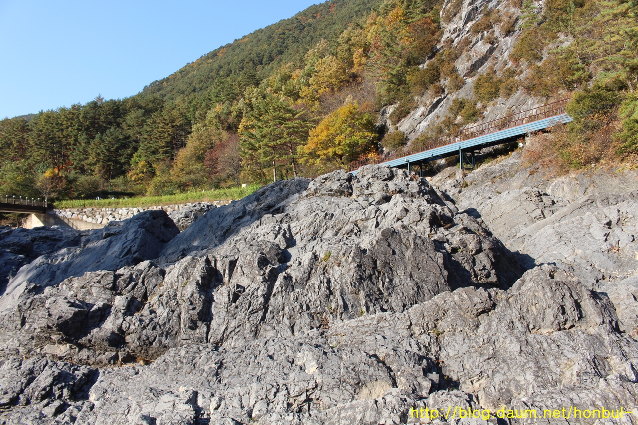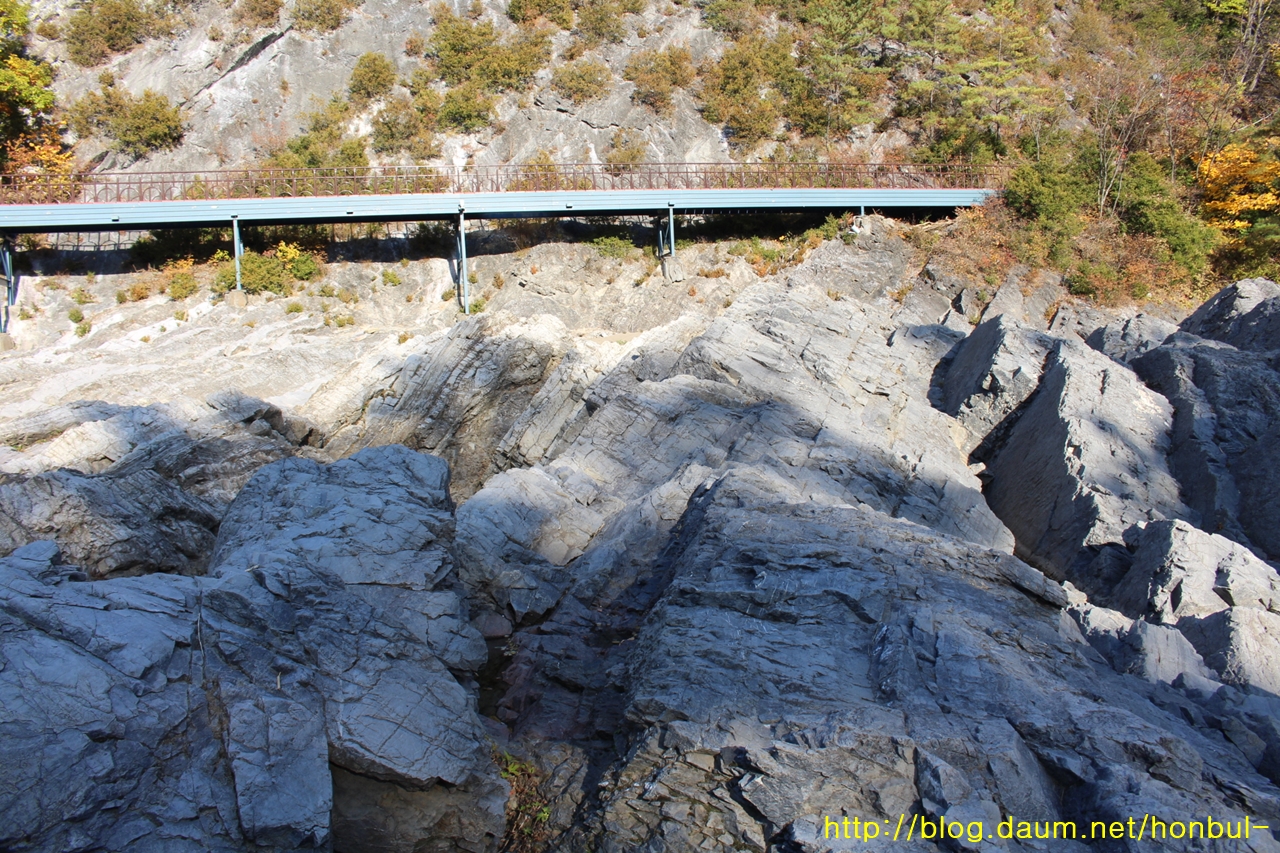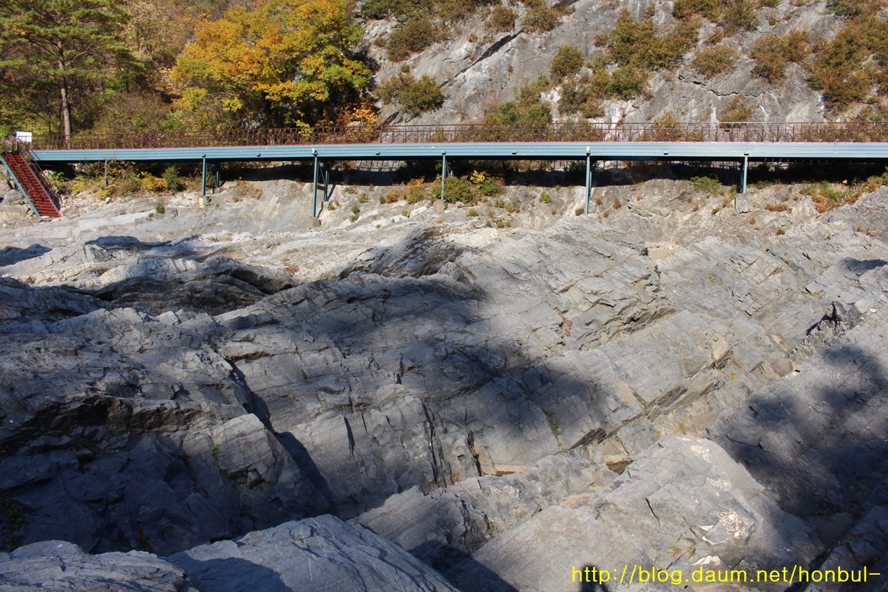 구문소의 석회암 층이 사선으로 기운 걸 볼 수 있다.