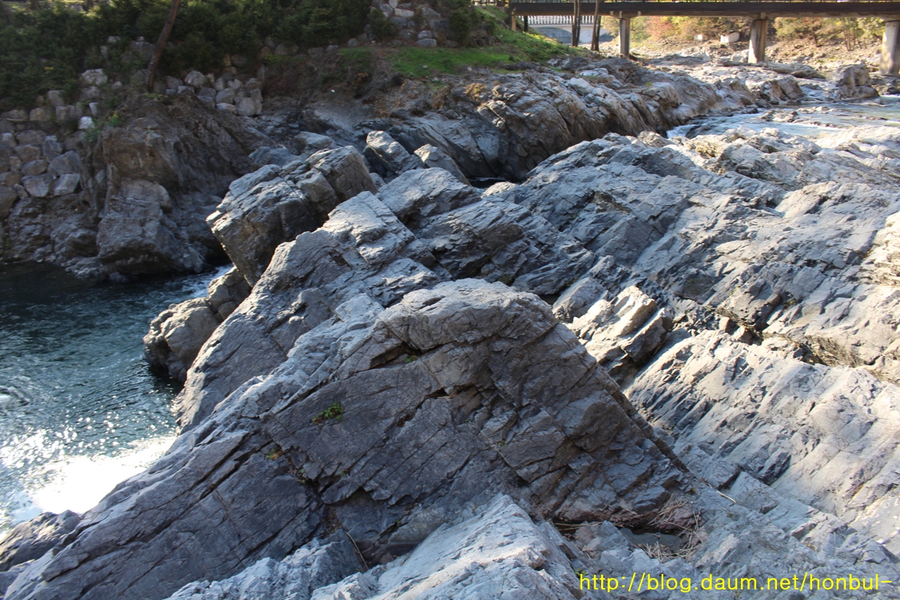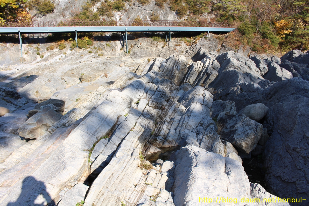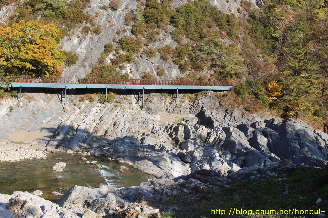 구문소의 석회암 층이 사선으로 기운 걸 볼 수 있다.