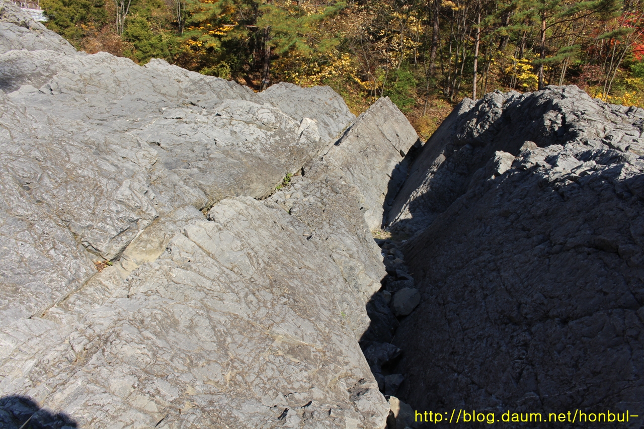 침식에 약한 석회암 지대라 물이 흐르며 단층을 만들기도 한다.