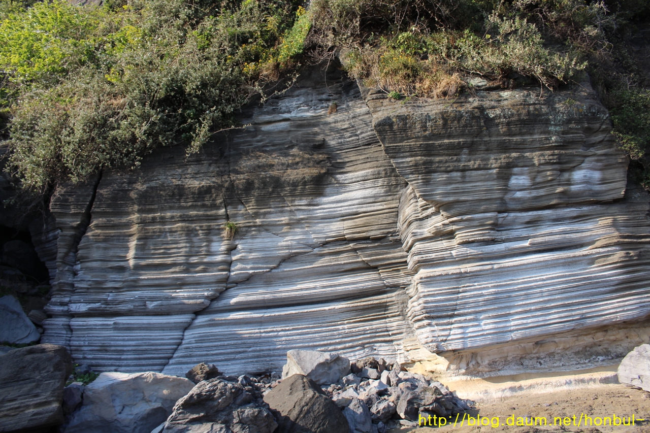 위쪽 바위면은 수직이고 아래쪽 암반은 수평 형태다.