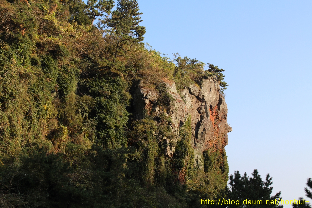 옆에서 본 바위는 이마와, 눈, 코, 덥수룩한 턱수염에 홍조가 든 사람 얼굴 형상이다.