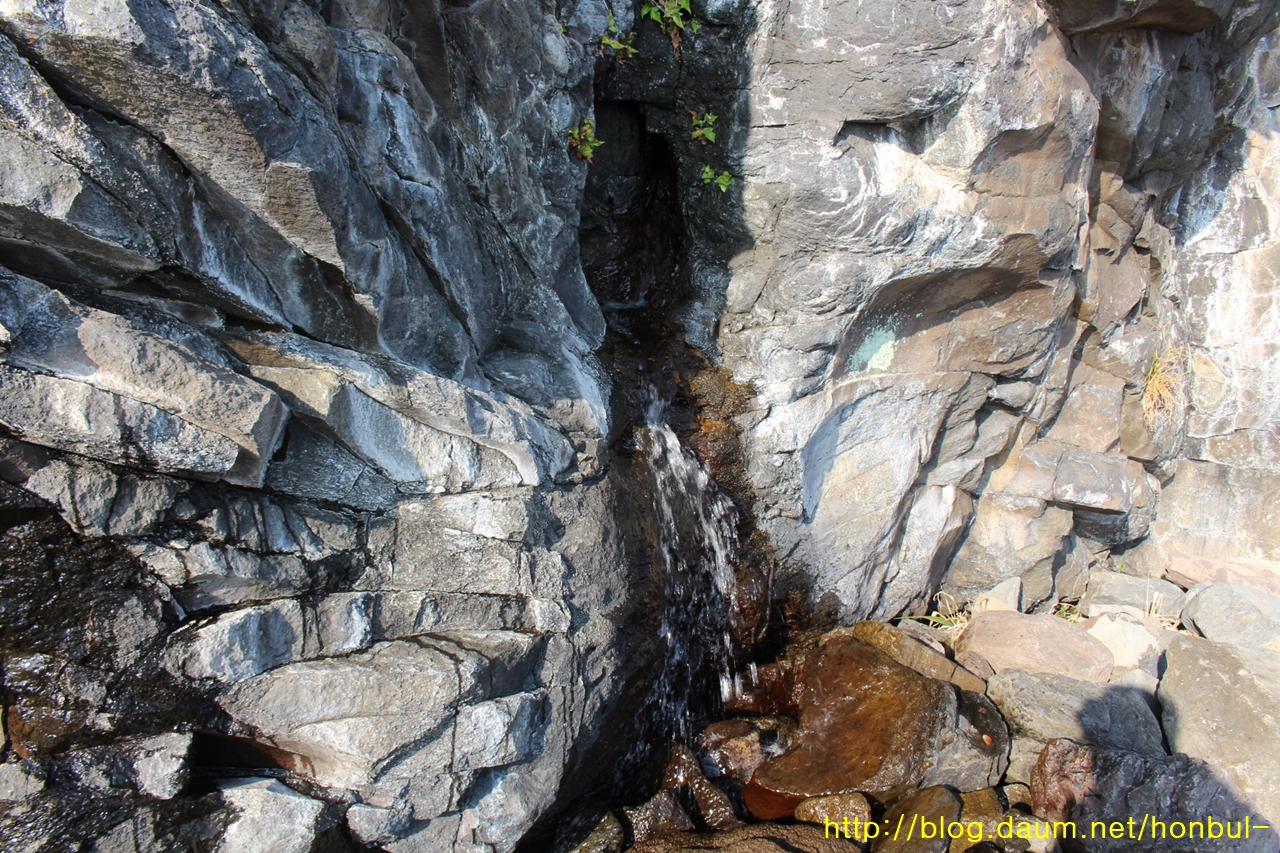 바위틈으로 용천수가 수도꼭지를 튼 것처럼 콸콸 흐른다.