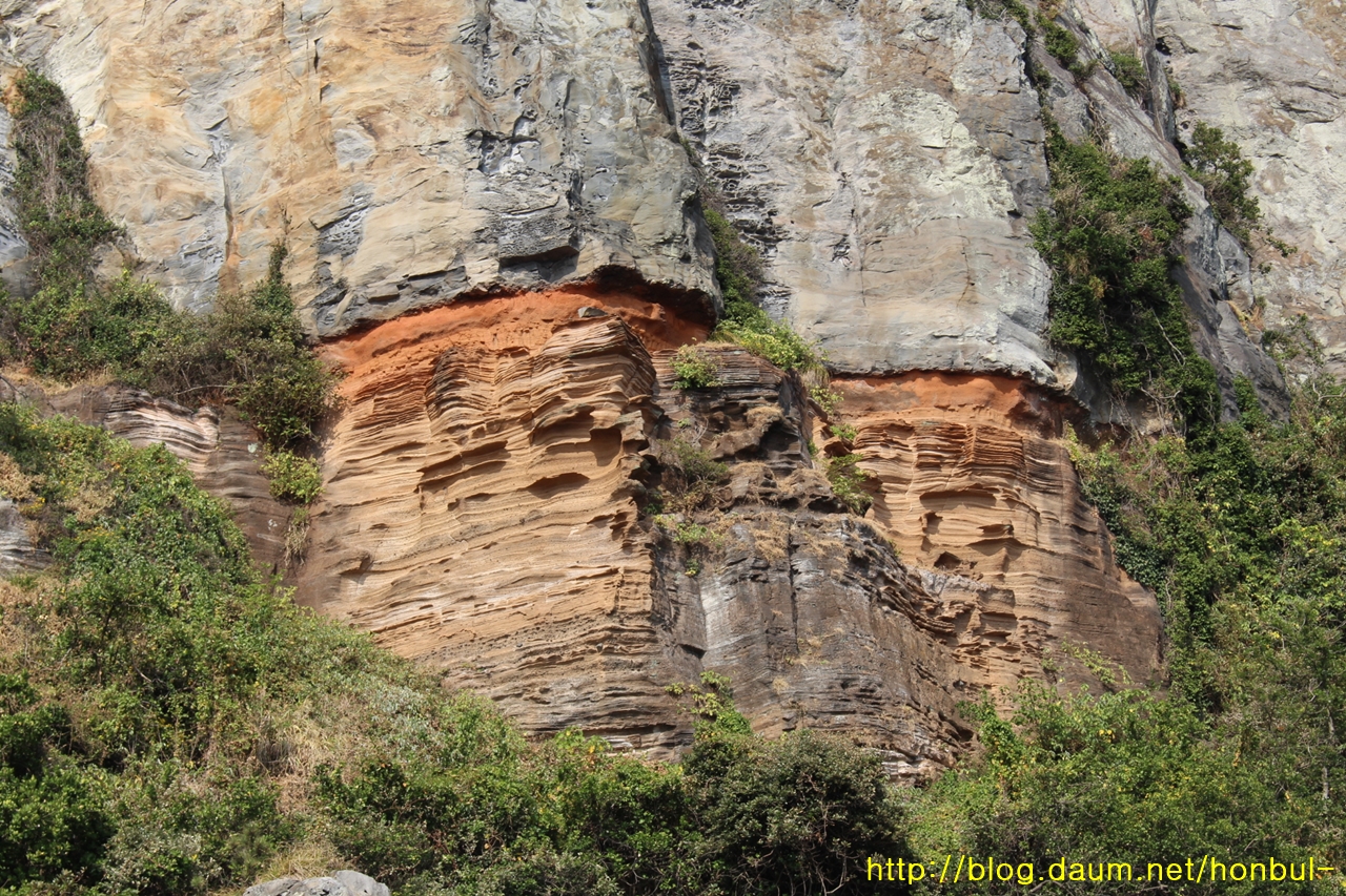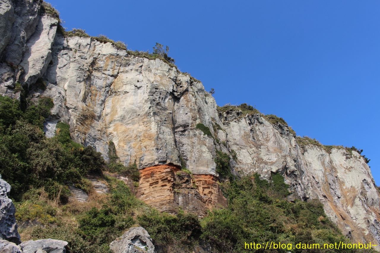 100여 m 높이의 박수기정에 붉은색 포인트를 준 너는 무슨 바위냐?