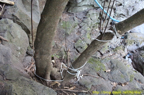 어렵게 오르고 보니 누군가 가느다란 자일을 나무에 돌려놓았다.