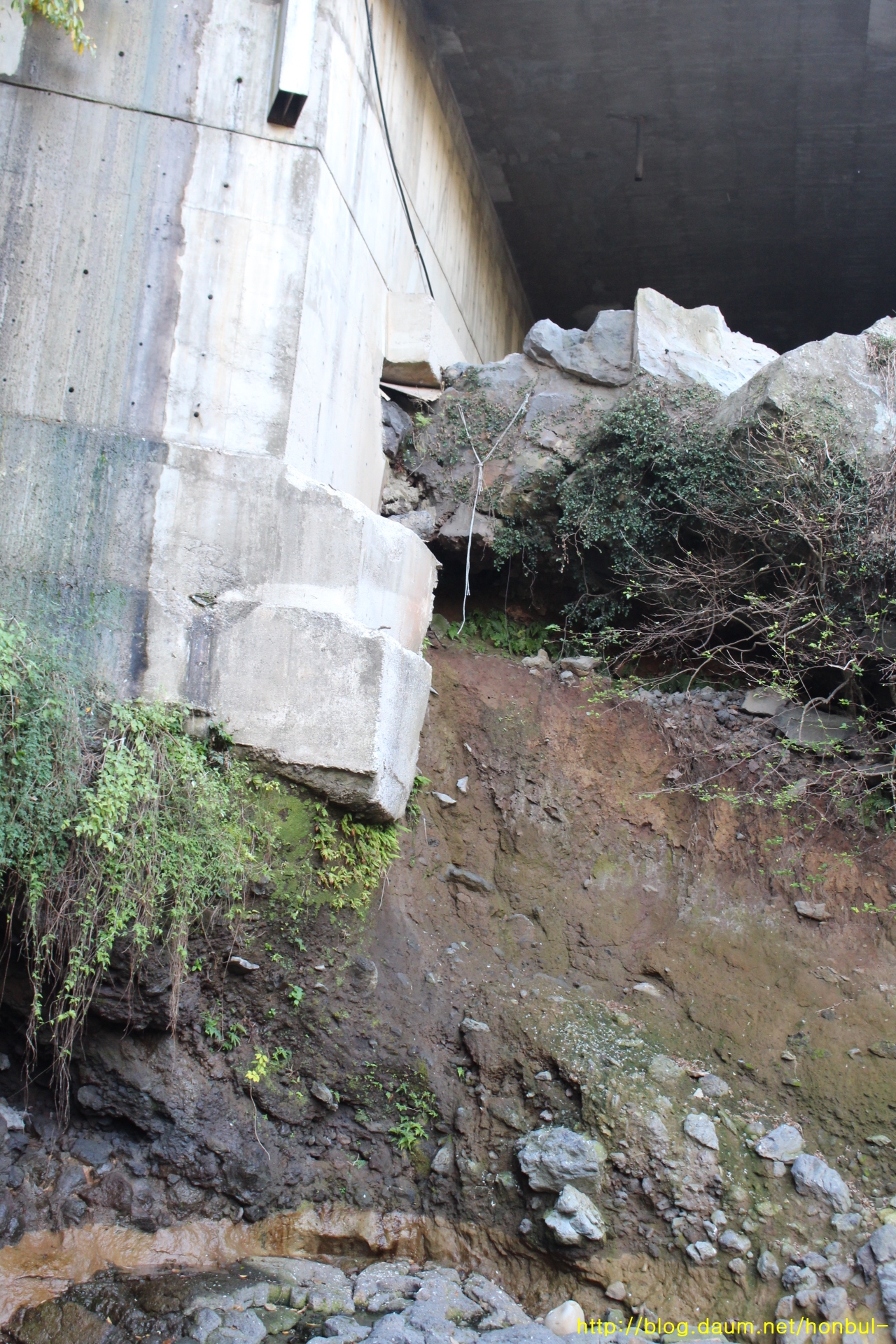 다리 교각이 폭포 상단에 설치된 게 보인다.
