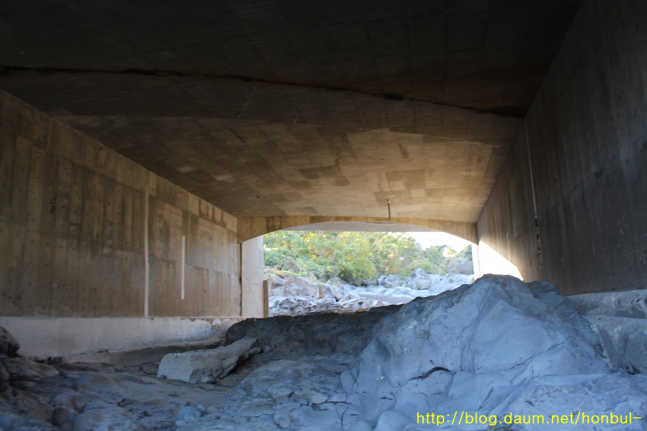 광령교 교각은 폭포 위 암반에 세워져 저 폭포를 온전히 보려면 천상 내려가야 한다.