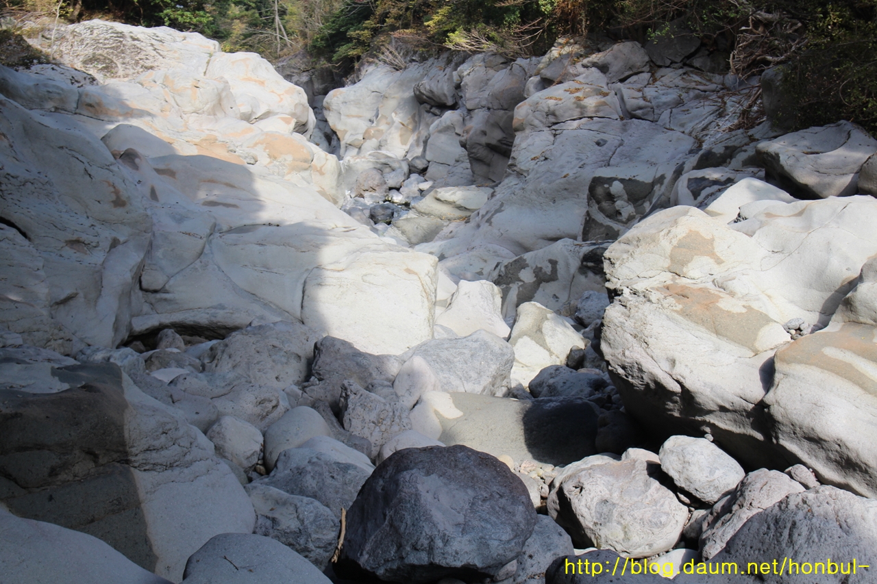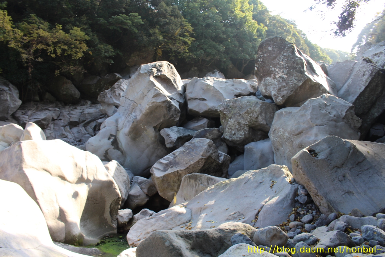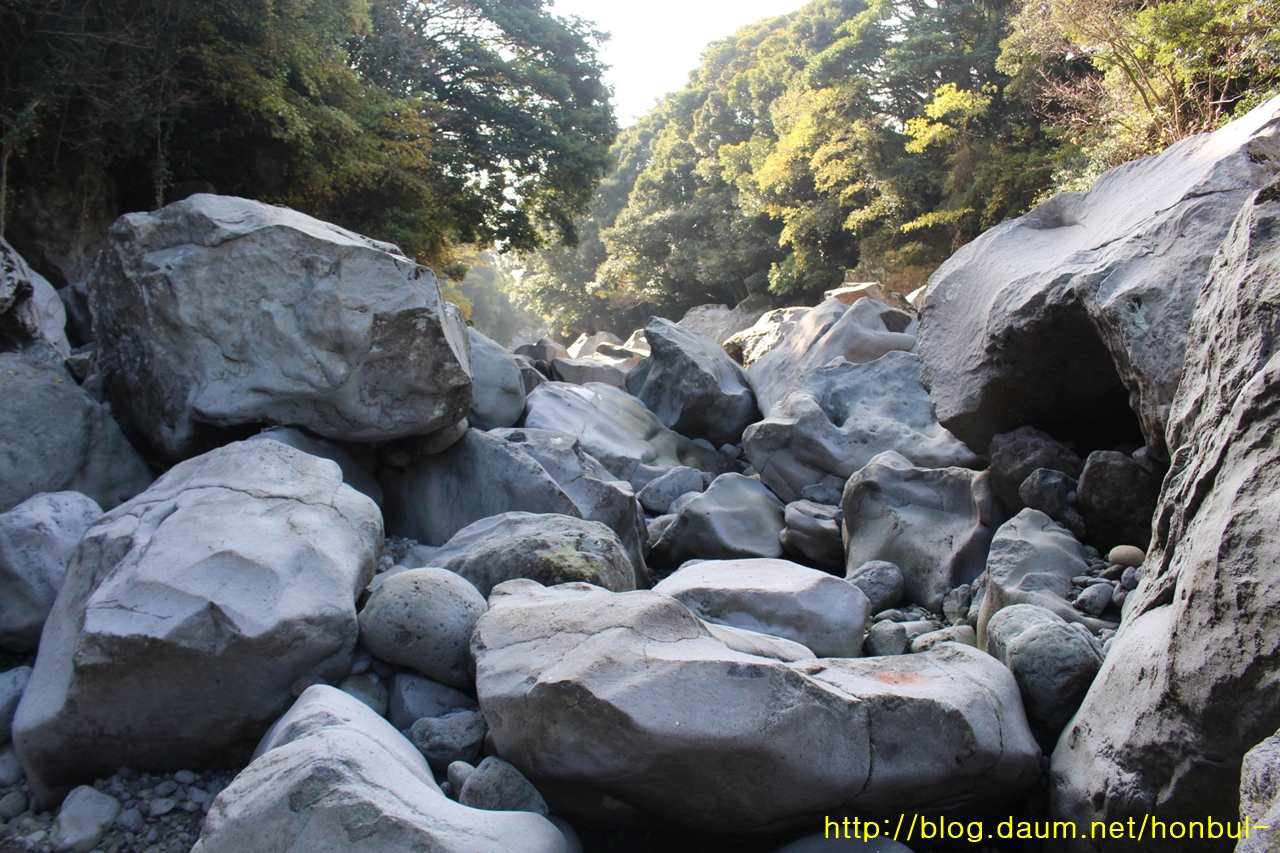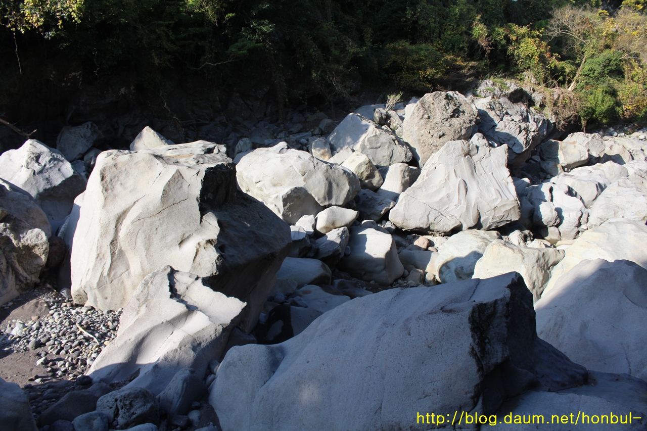상류로 갈수록 더 크고 거친 돌이 가로막는다.