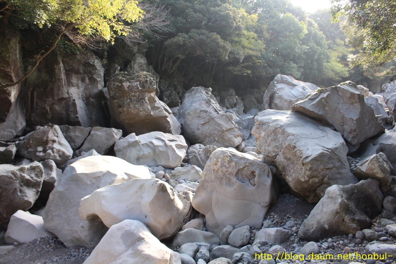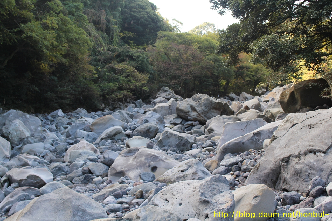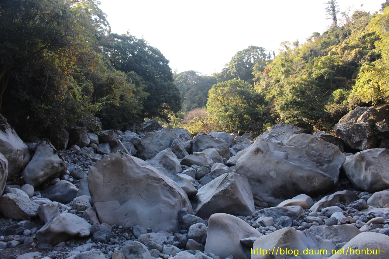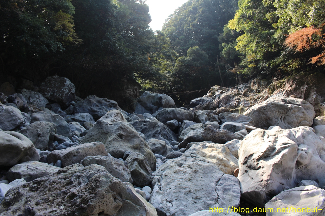상류로 갈수록 더 크고 거친 돌이 가로막는다.