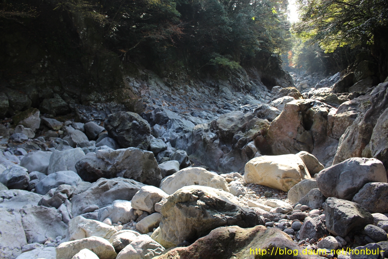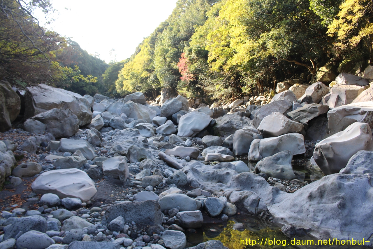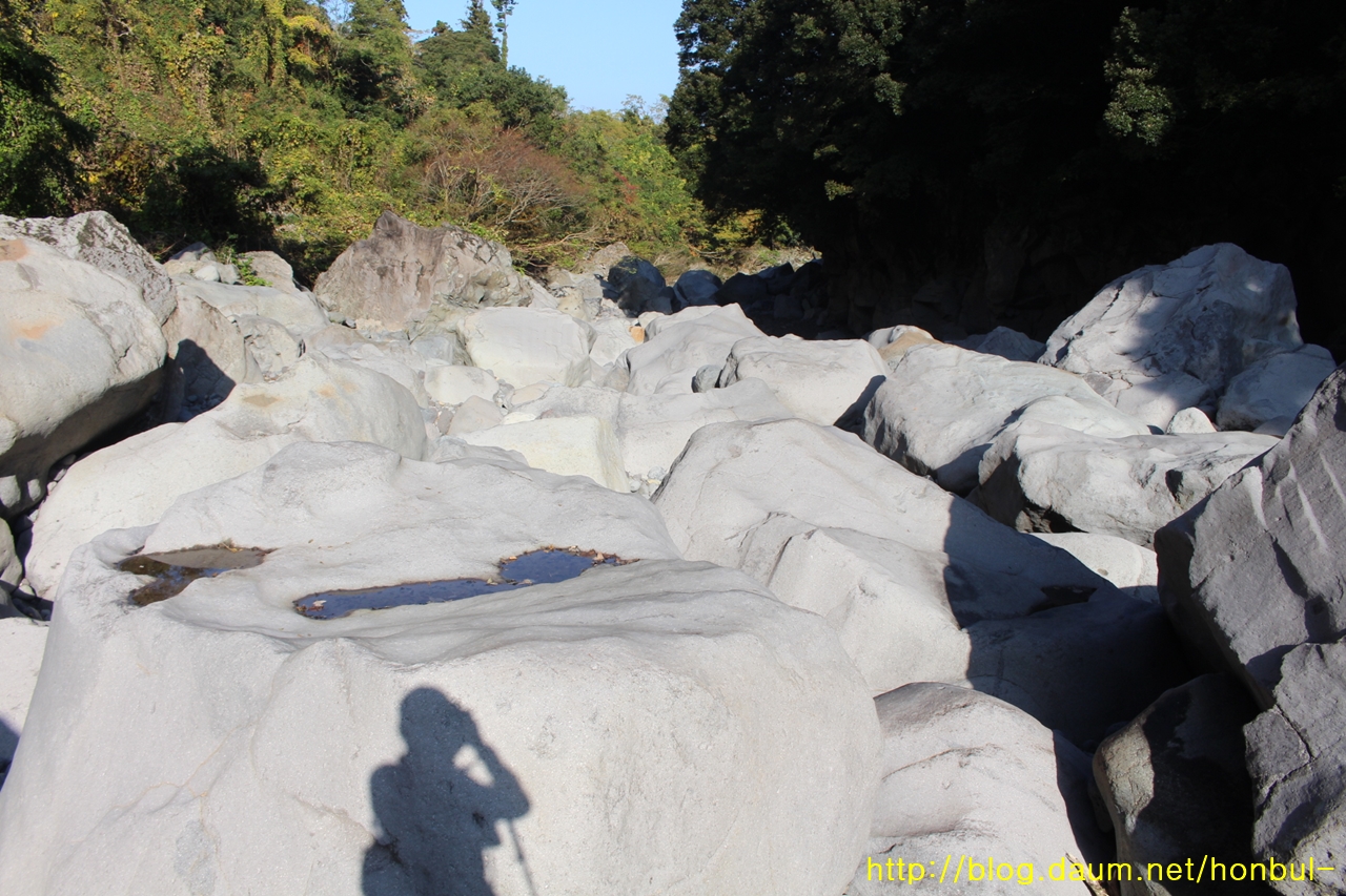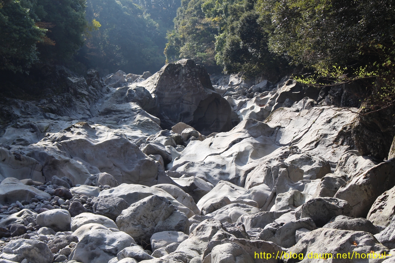 상류로 갈수록 더 크고 거친 돌이 가로막는다.