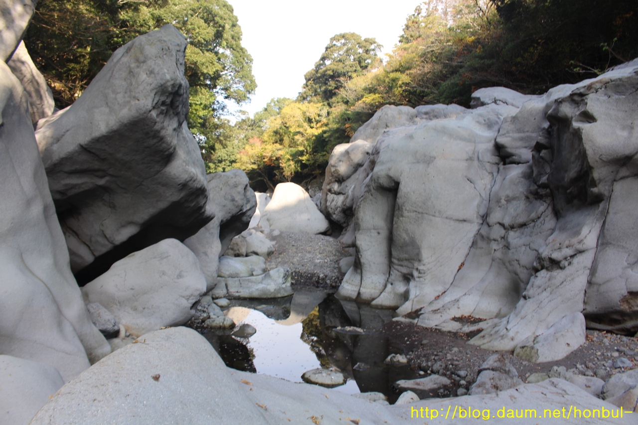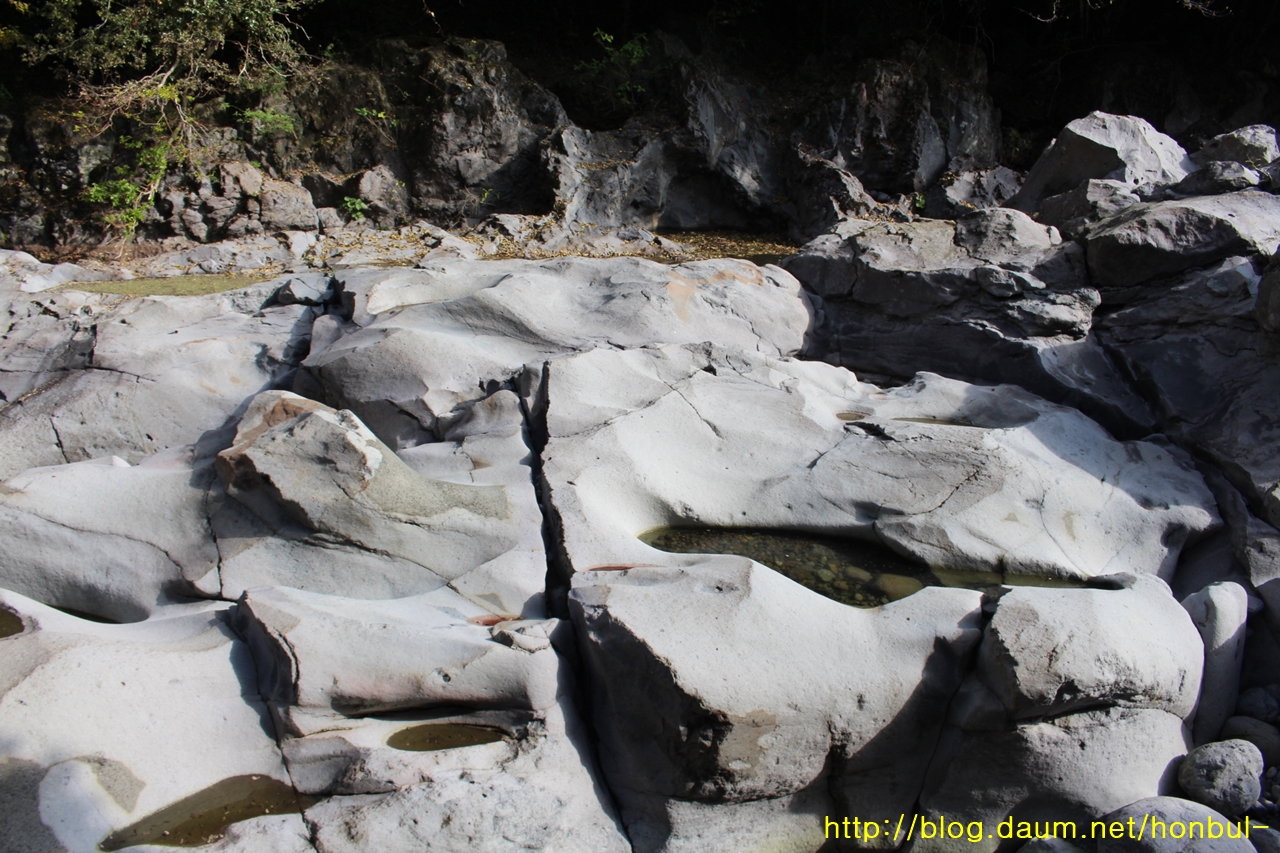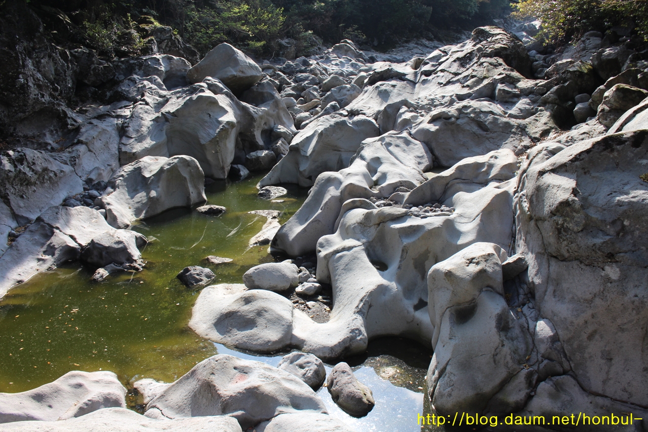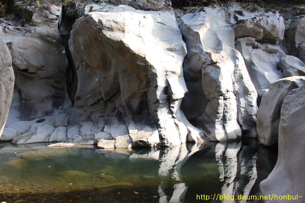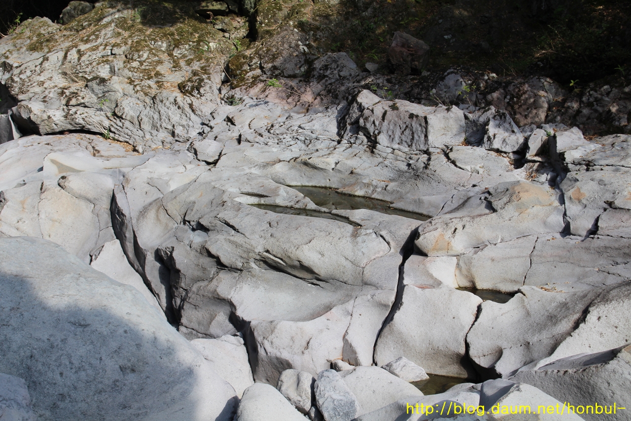 바위산이 물줄기를 막아 좁게 흐른 물살은 더 세게 떨어지며 제법 큰 소를 만들었다.