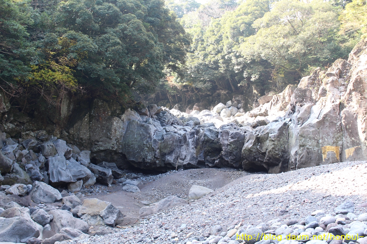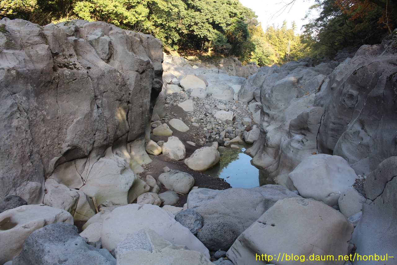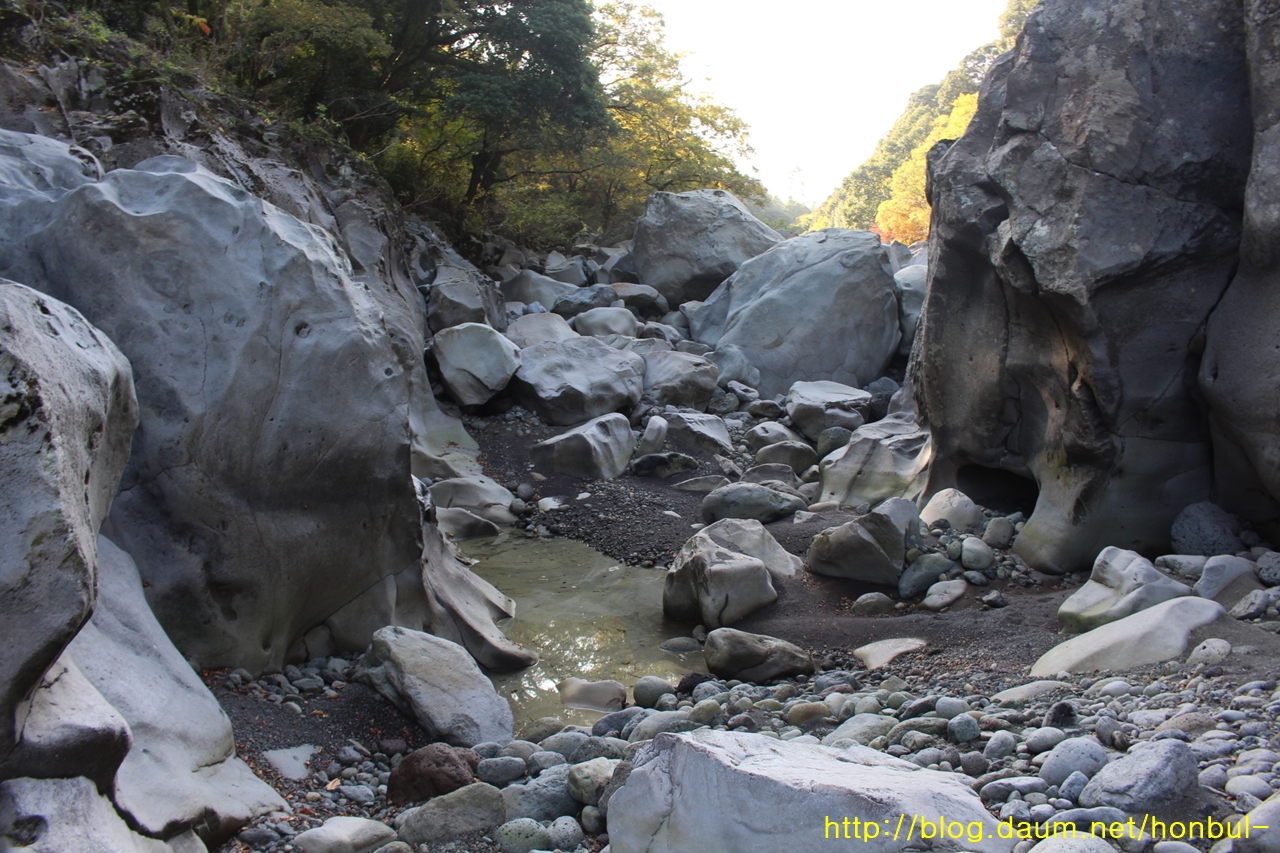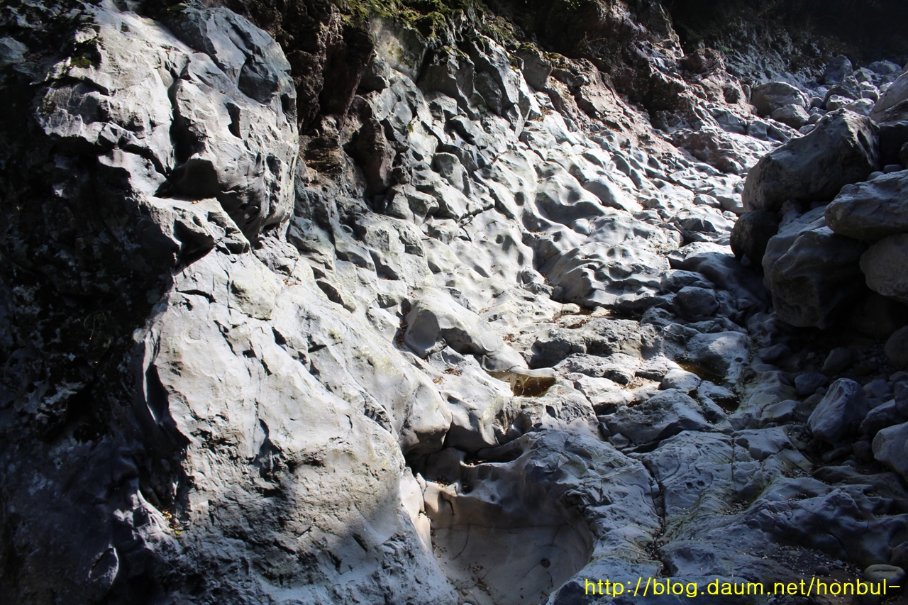 물길이 용암 바닥을 치고 나가 점점 파여 들어간다.
