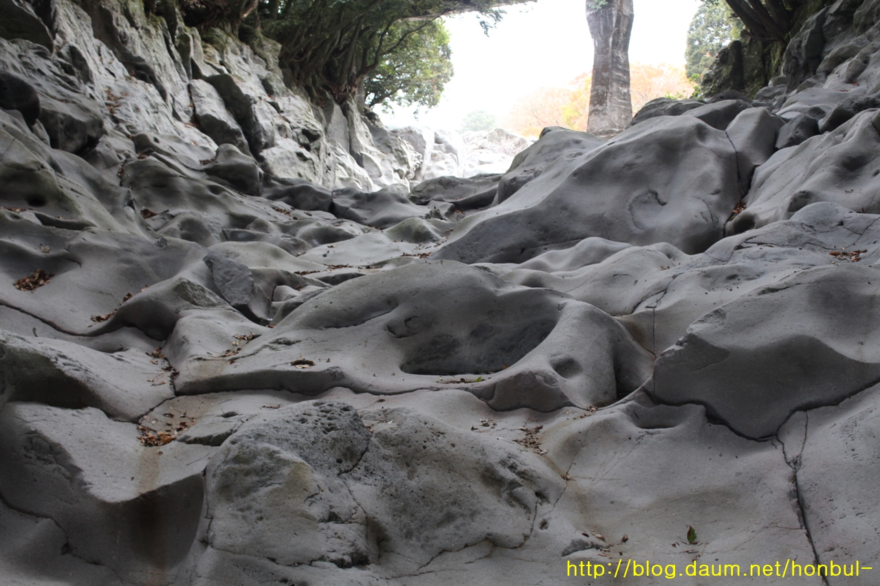 용암 바닥이 이 폭포에서 빠져 죽은 생명체가 절규하는 듯한 두개골 형상이다.