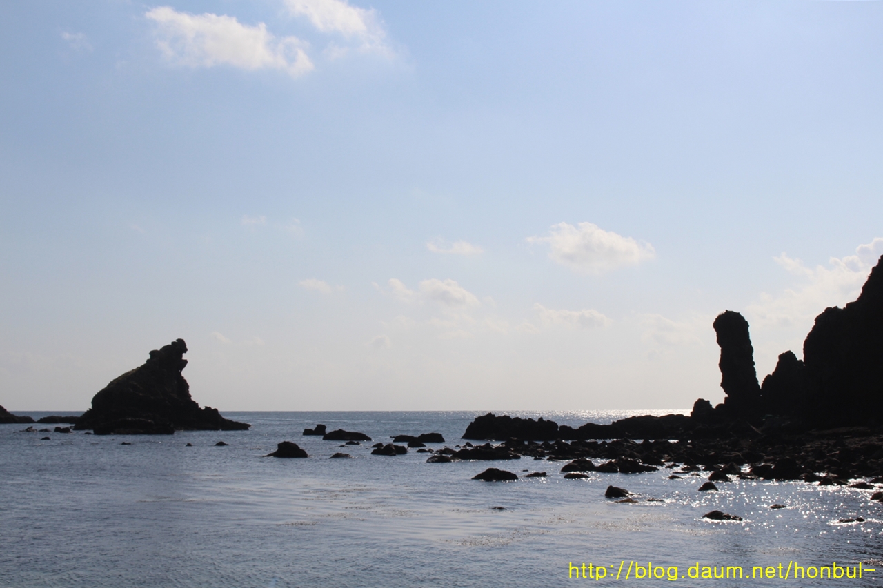 배를 타고 나갈 때 동쪽 해변에 산재한 바위섬을 보기 위해 잠시 돌아간다.