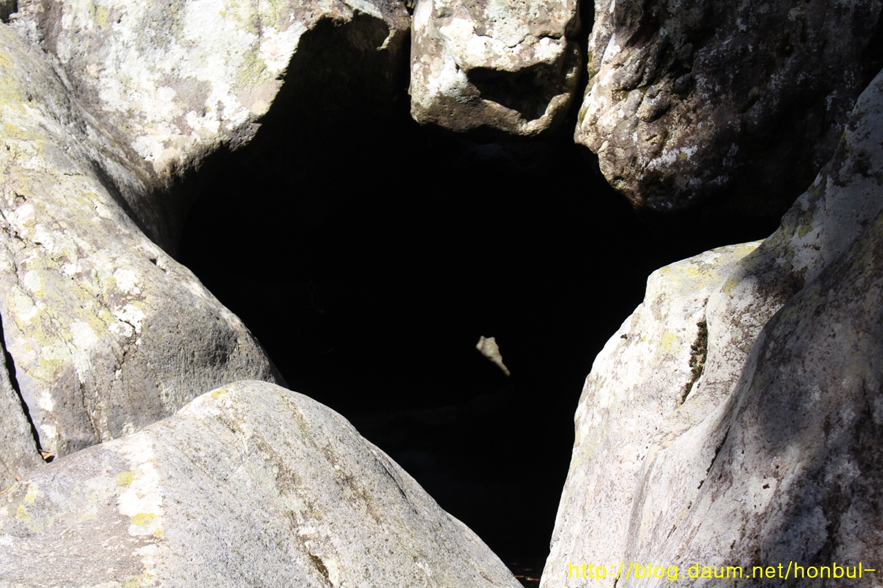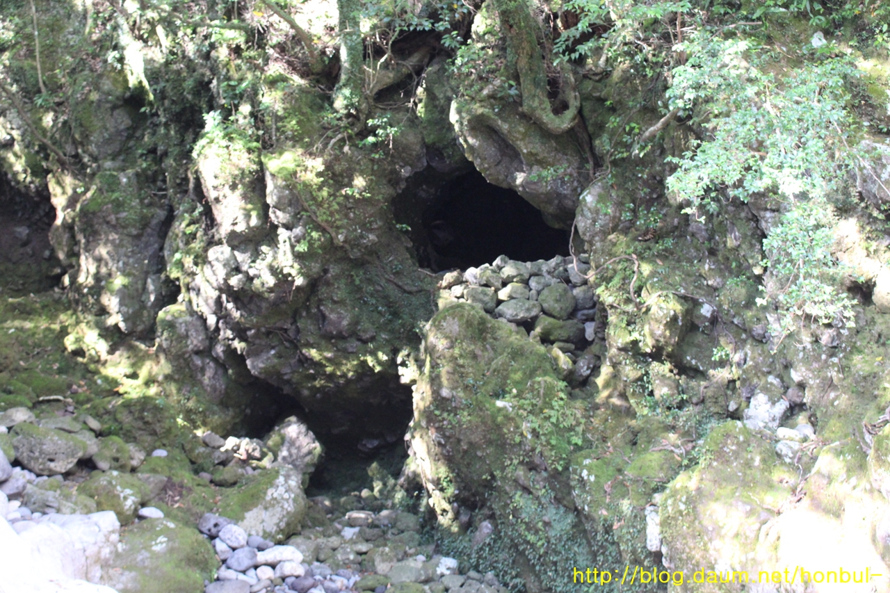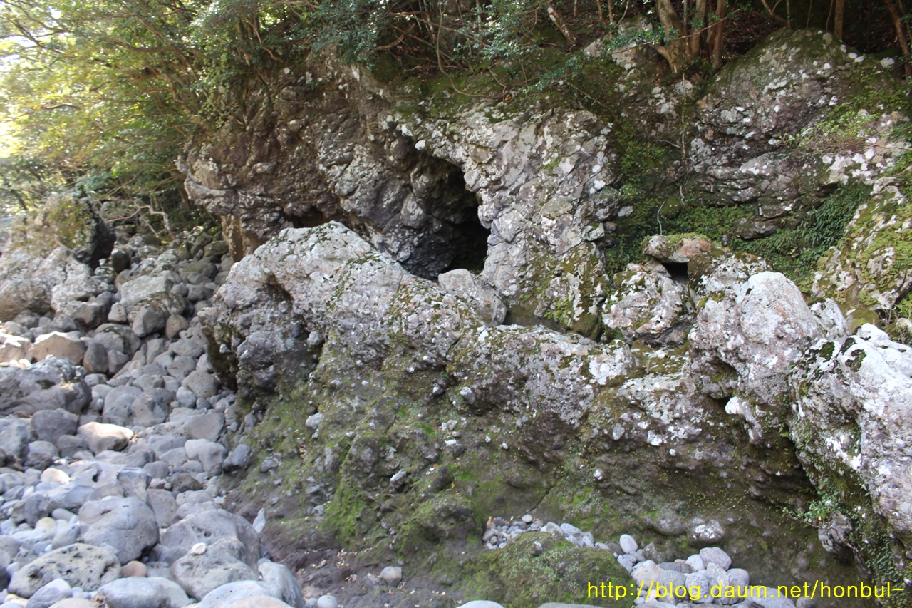 폭우가 내리면 물이 차 바위 아래 작은 굴은 다 감춰지겠다.