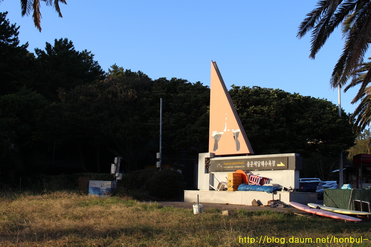 중문색달해변 건너편으로 더쇼어호텔 건물이 보인다.