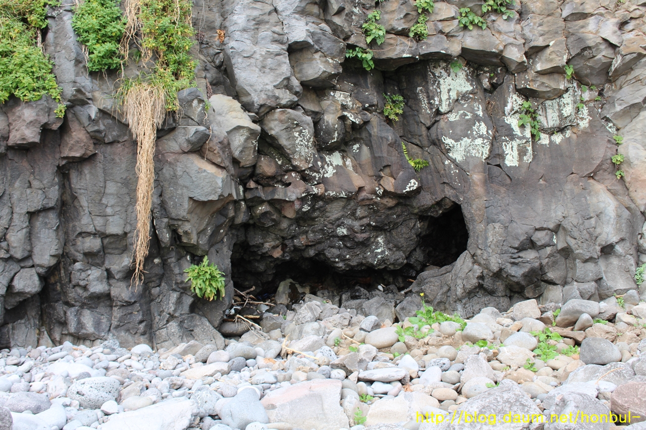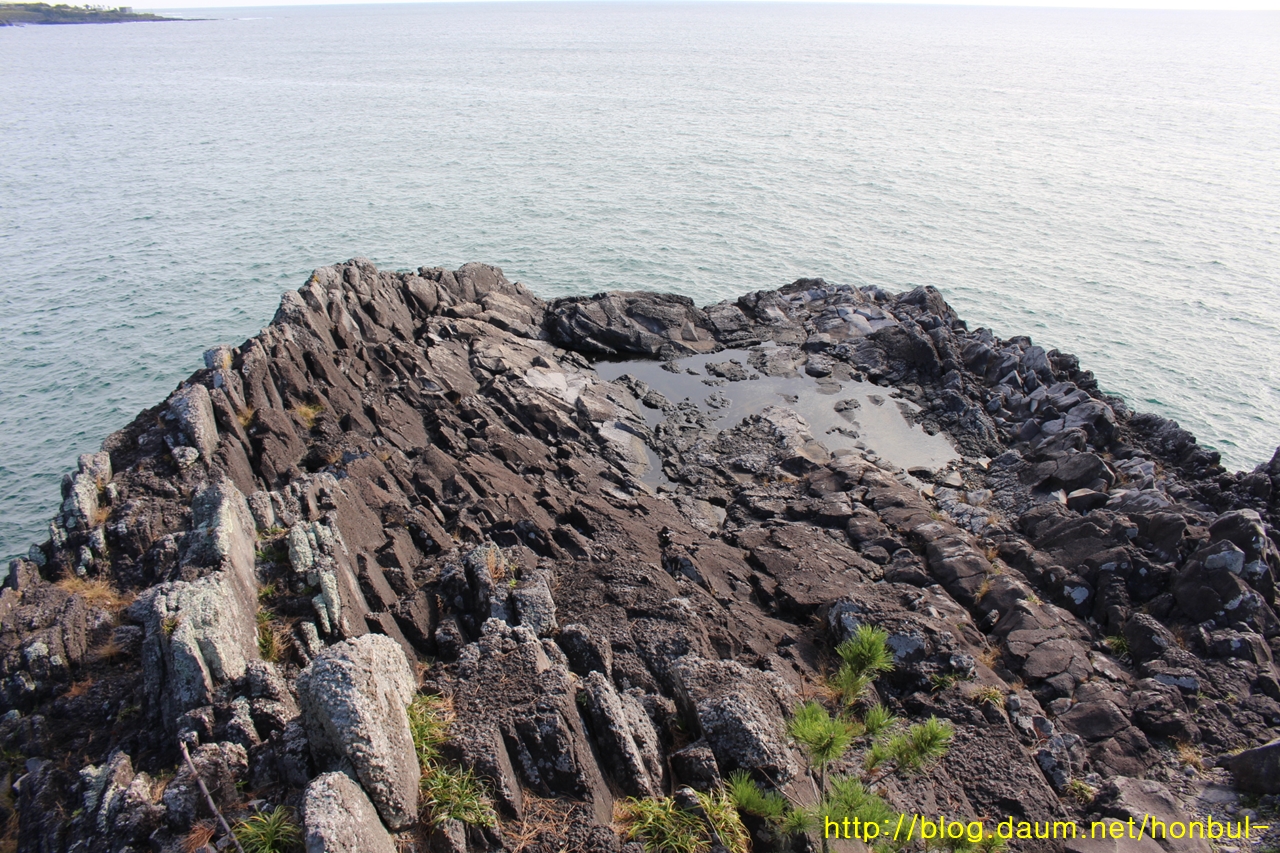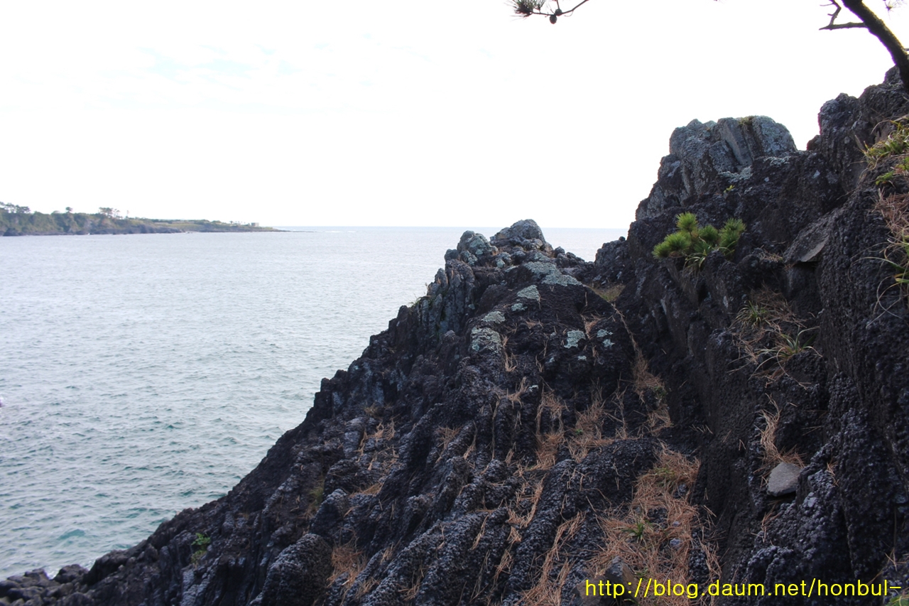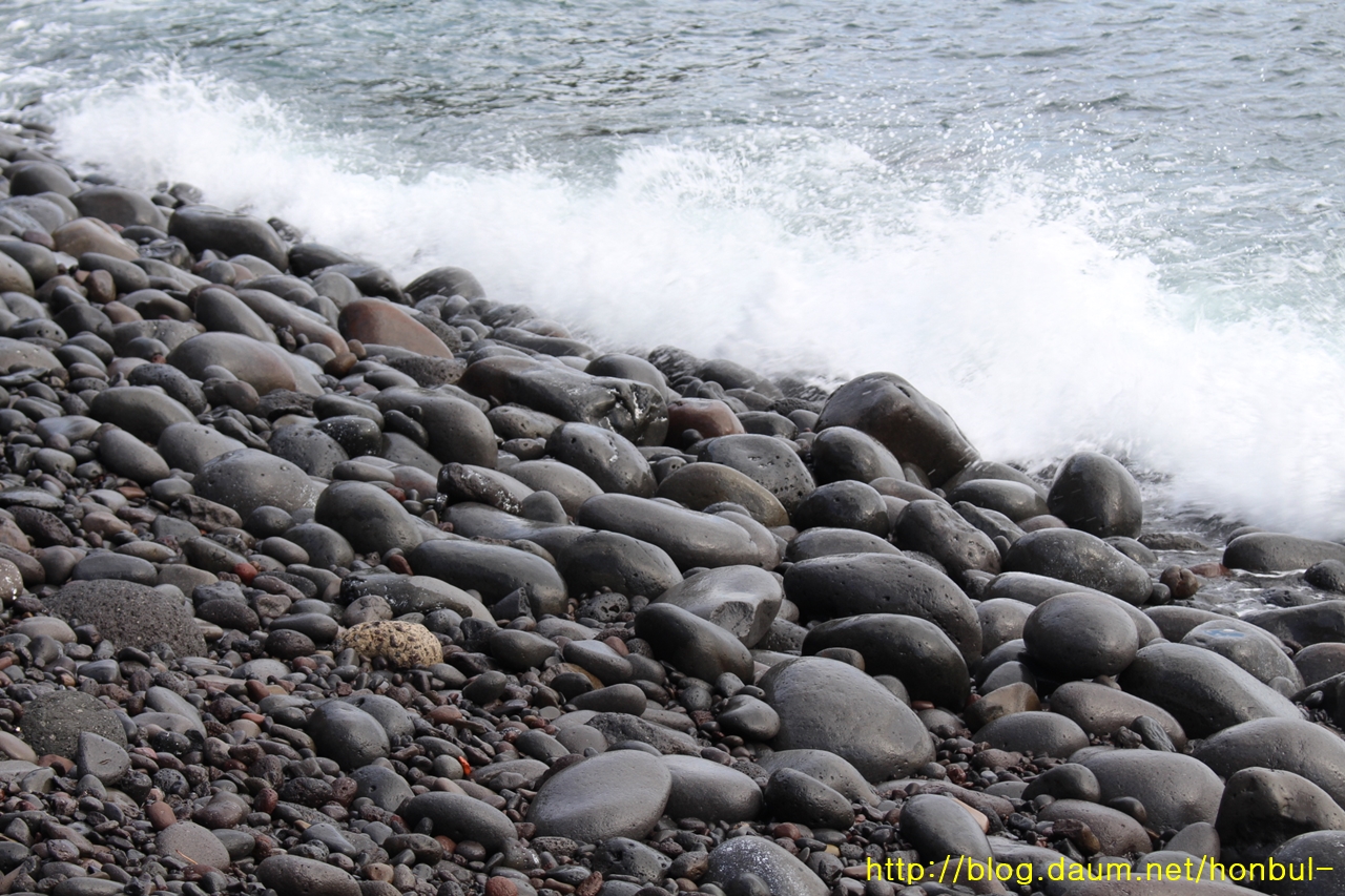 수없이 많은 파도에 씻겨져 내려가도 색 바래지 않고 여전히 검은 현무암 바위다.