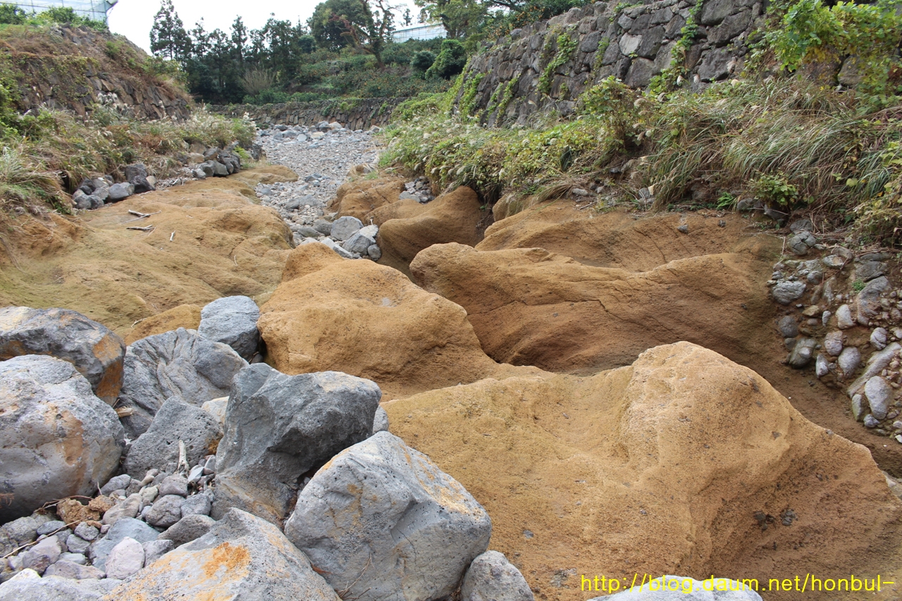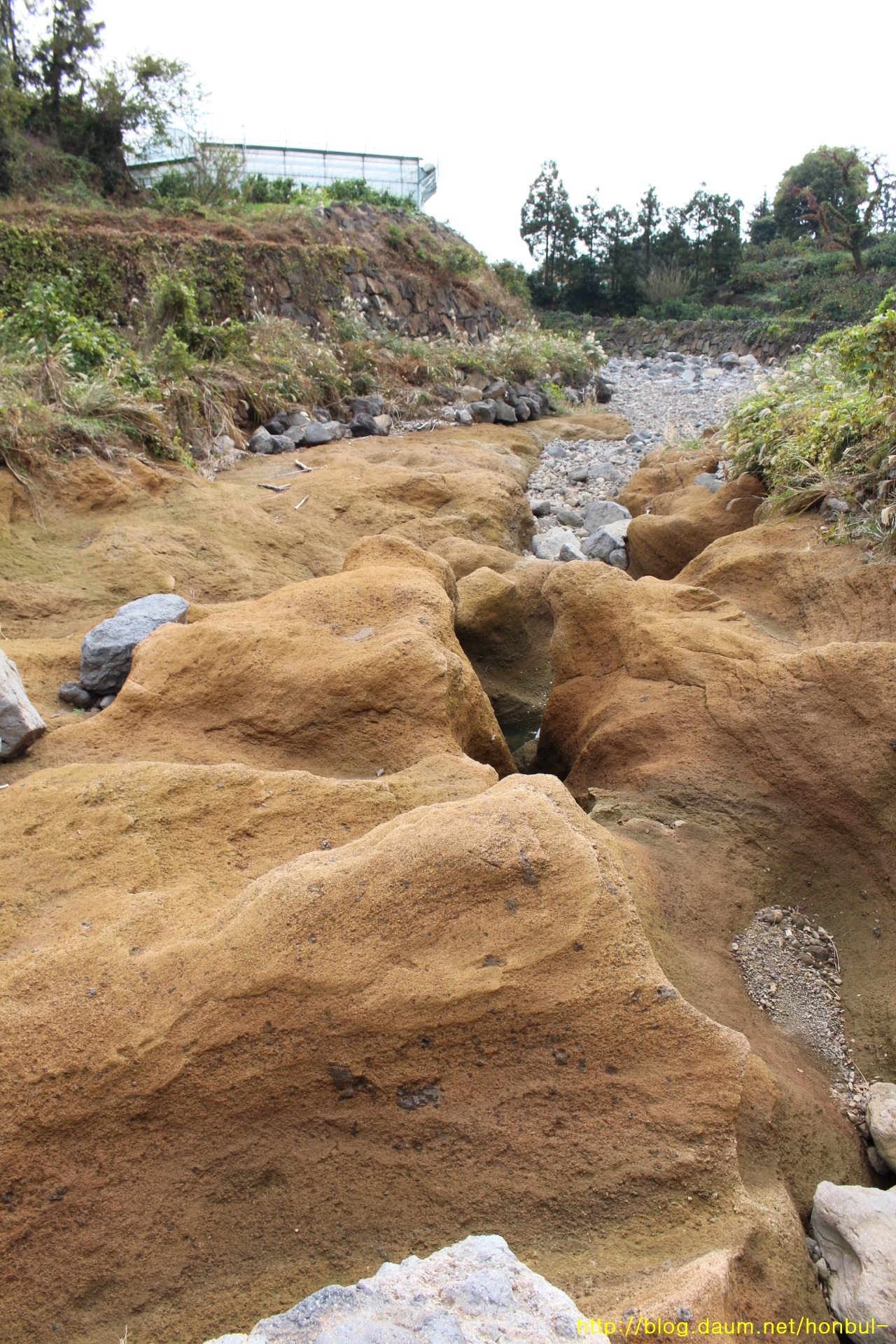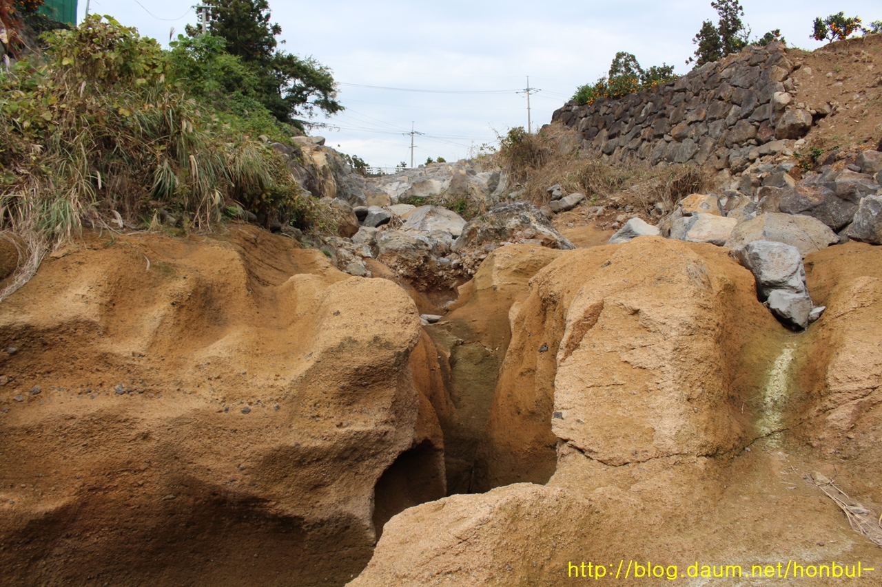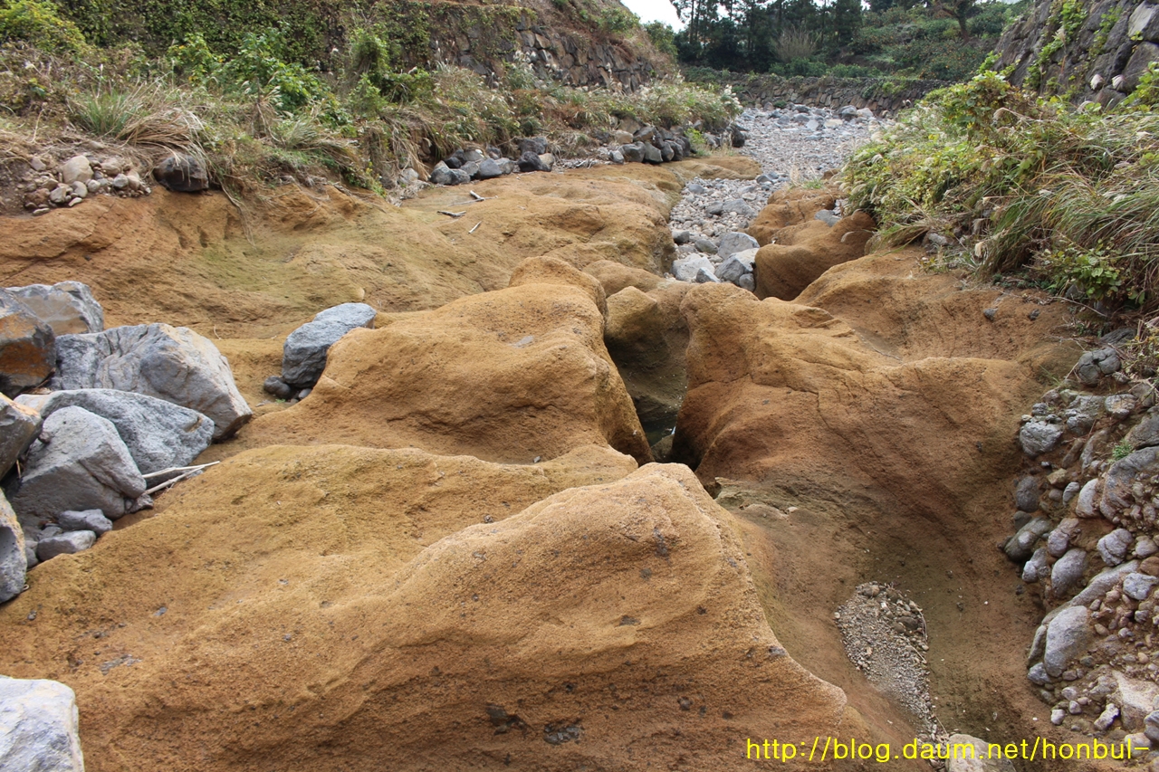 여기서부터 용암은 현무암 특유의 검은색이 아니라 갑자기 황토색으로 바뀐다.