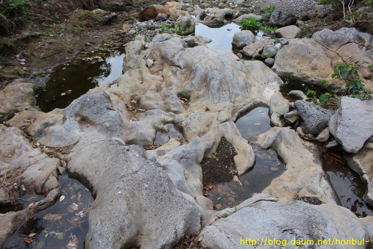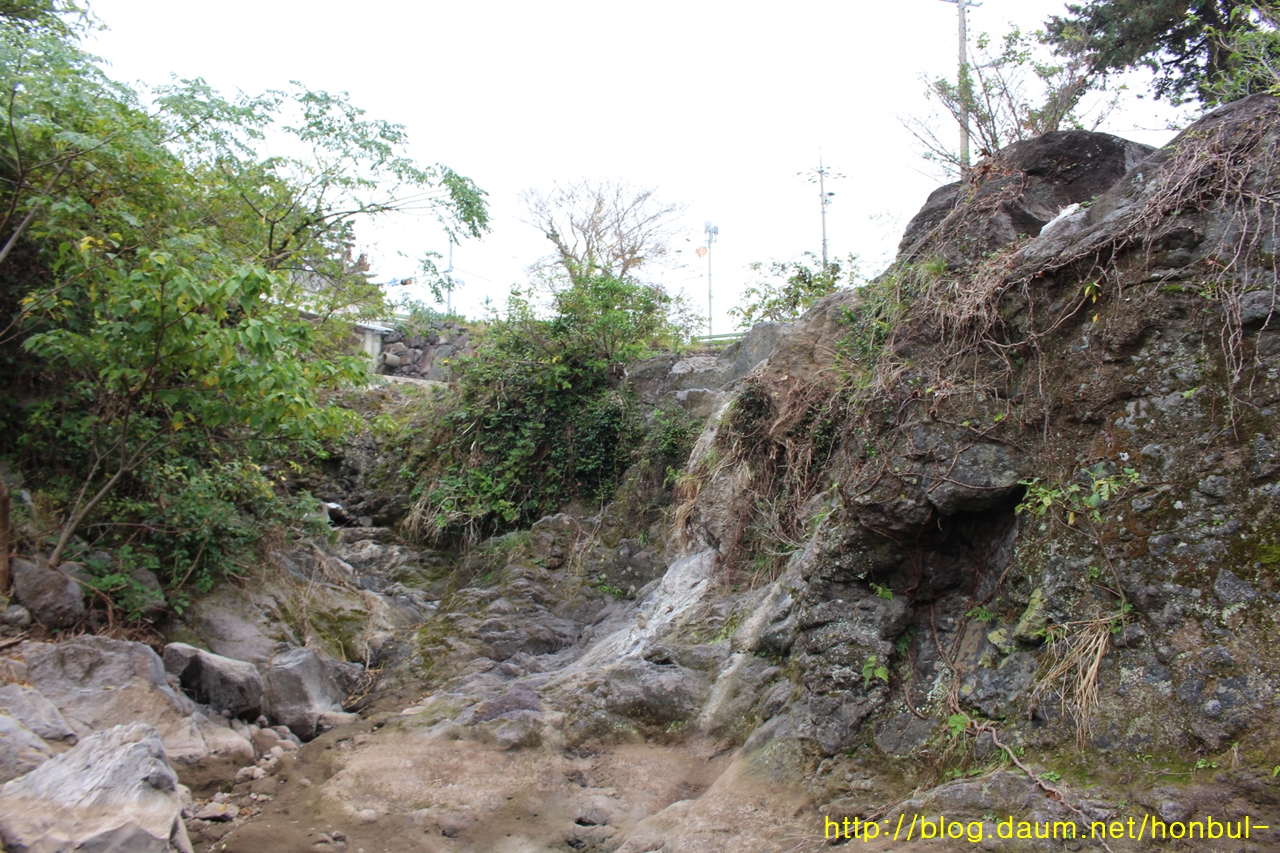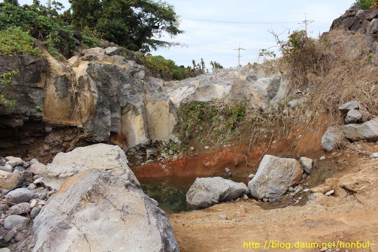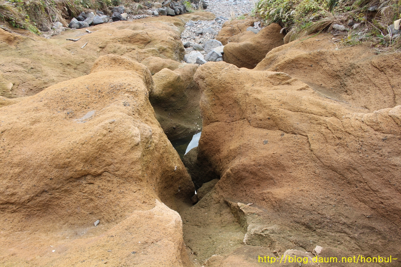 여기서부터 용암은 현무암 특유의 검은색이 아니라 갑자기 황토색으로 바뀐다.