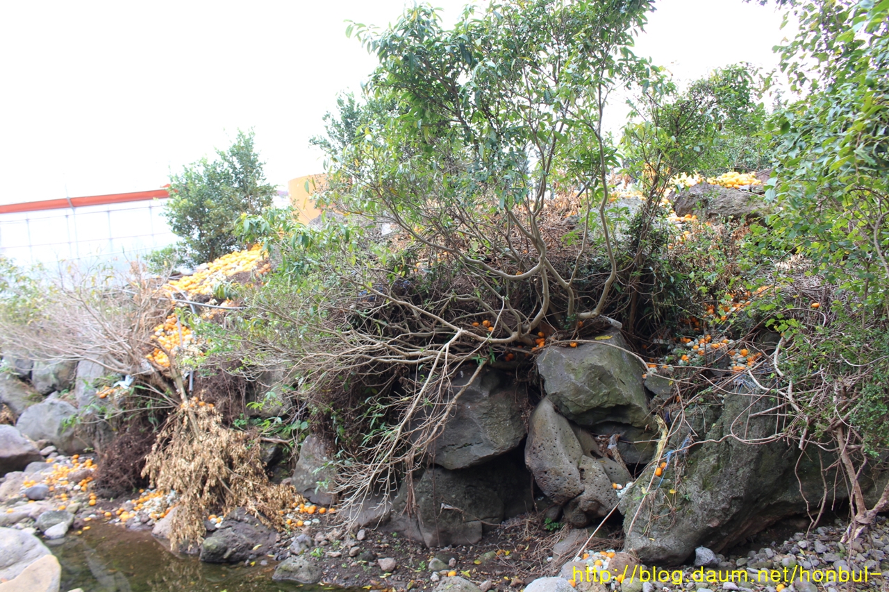 어느 순간 귤 상한 냄새가 나더니 폐기된 귤이 냇가 둑으로 그득하다.