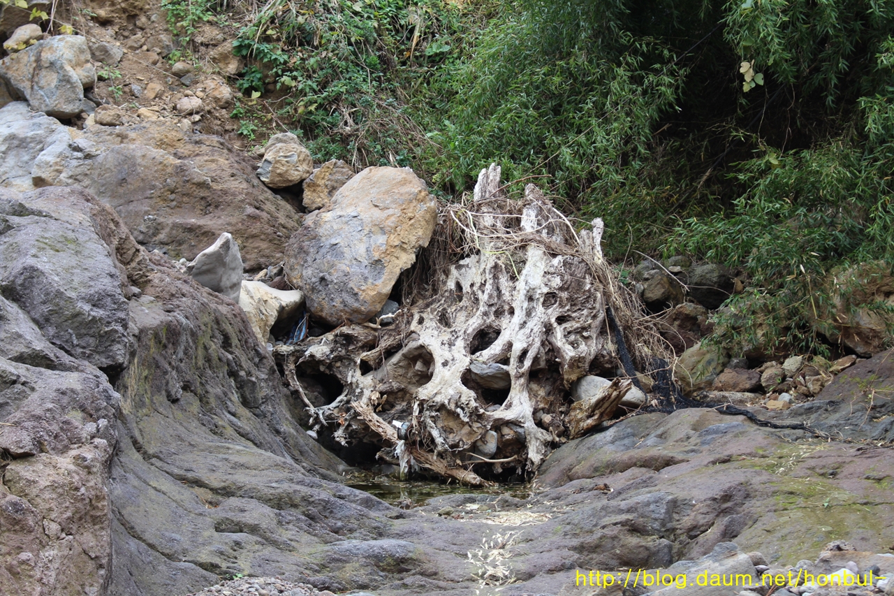 턱 밑에 떨어진 바위도 언젠가 물이 안쪽 흙을 파내며 붕괴시킨 것이겠다.