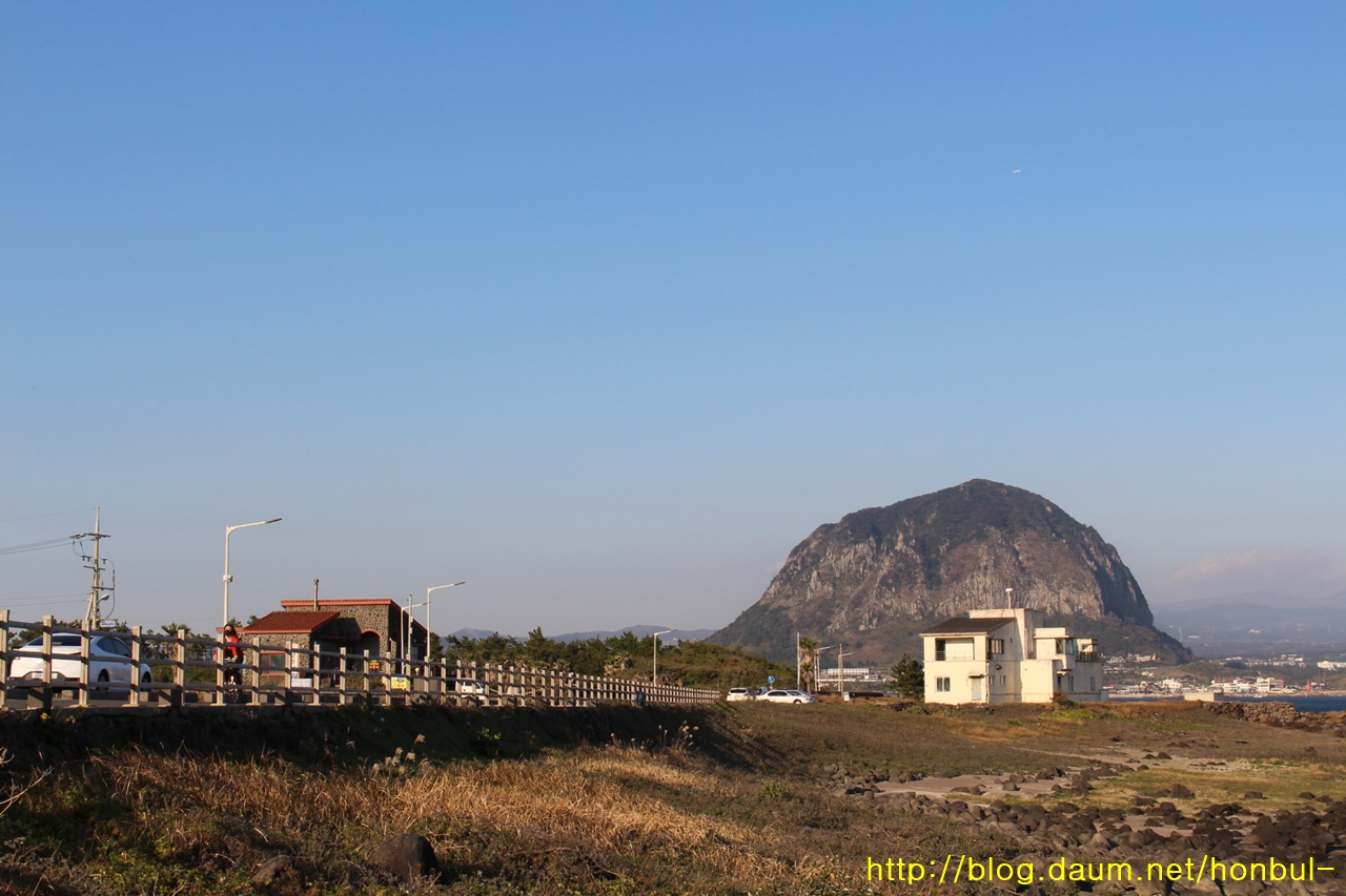 해안가에 우뚝 솟은 산방산은 이 지역의 랜드마크이다.