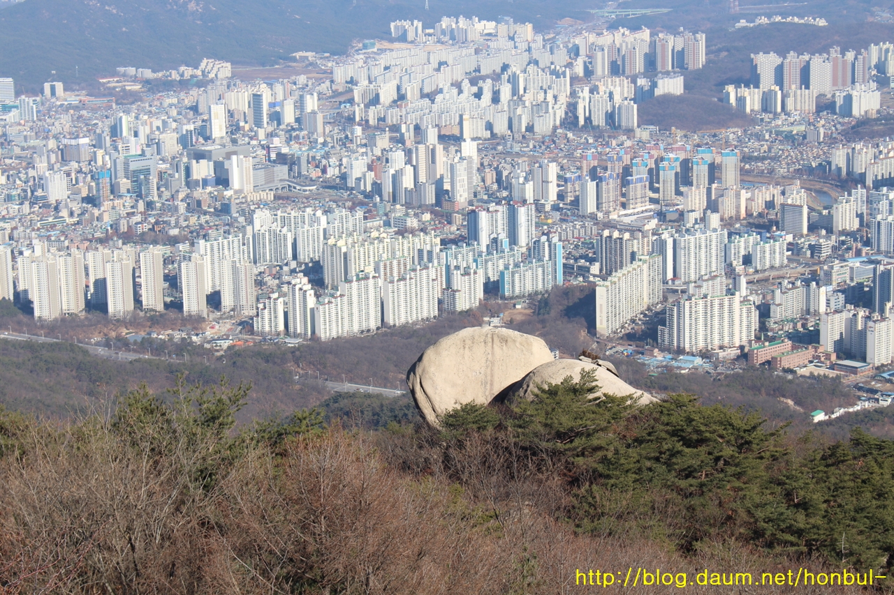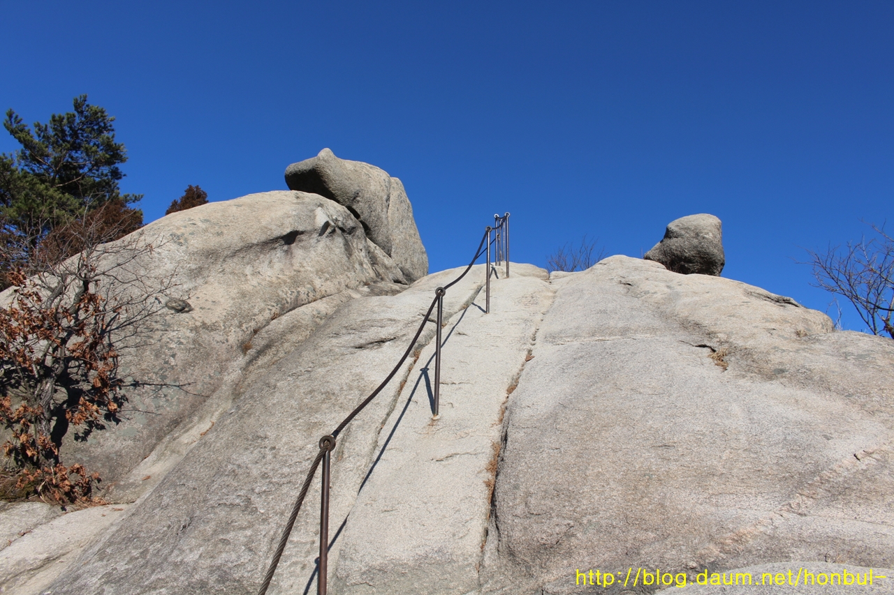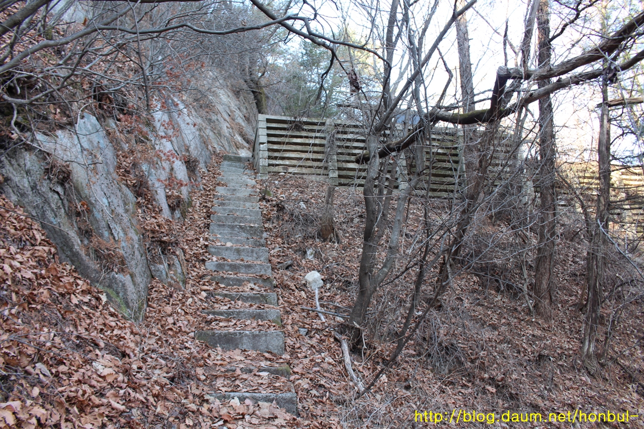왼쪽 바위가 포대능선의 암릉이고 이 시멘트 계단을 내려오면 왼쪽에 나타나는 첫 번째 바위에 해골바위가 있다.