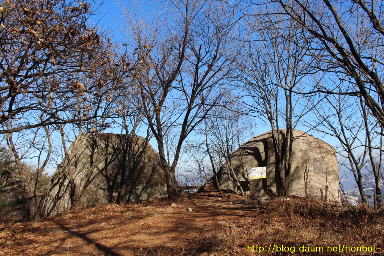 산불감시초소 앞 안부에서 우측으로 내려가면 하단 소나무 구간을 지나 첫 번째 만나는 바위 옆면이 해골바위다.