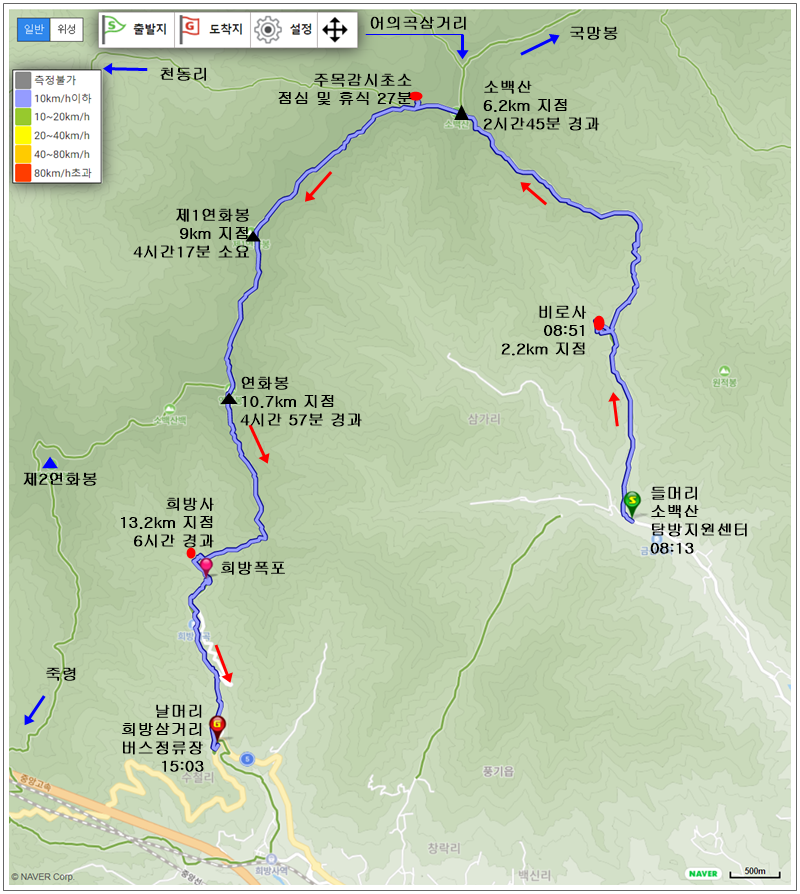 희방사로 하산해 출발 10분 전에 도착한 버스에 오른 후 풍기에서 내려 차량을 회수한다.