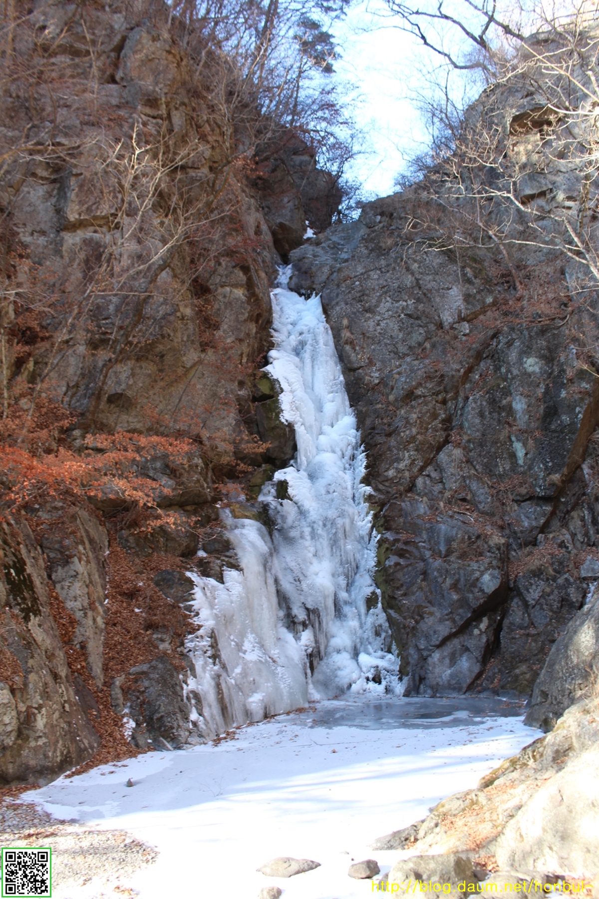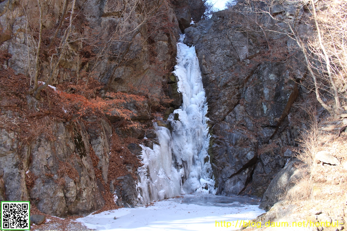 겨울은 갈수기라 소 오줌 줄기만큼 물이 떨어질 텐데, 그런 물이 얼고 얼어 제법 폭포다운 풍취를 보인다.