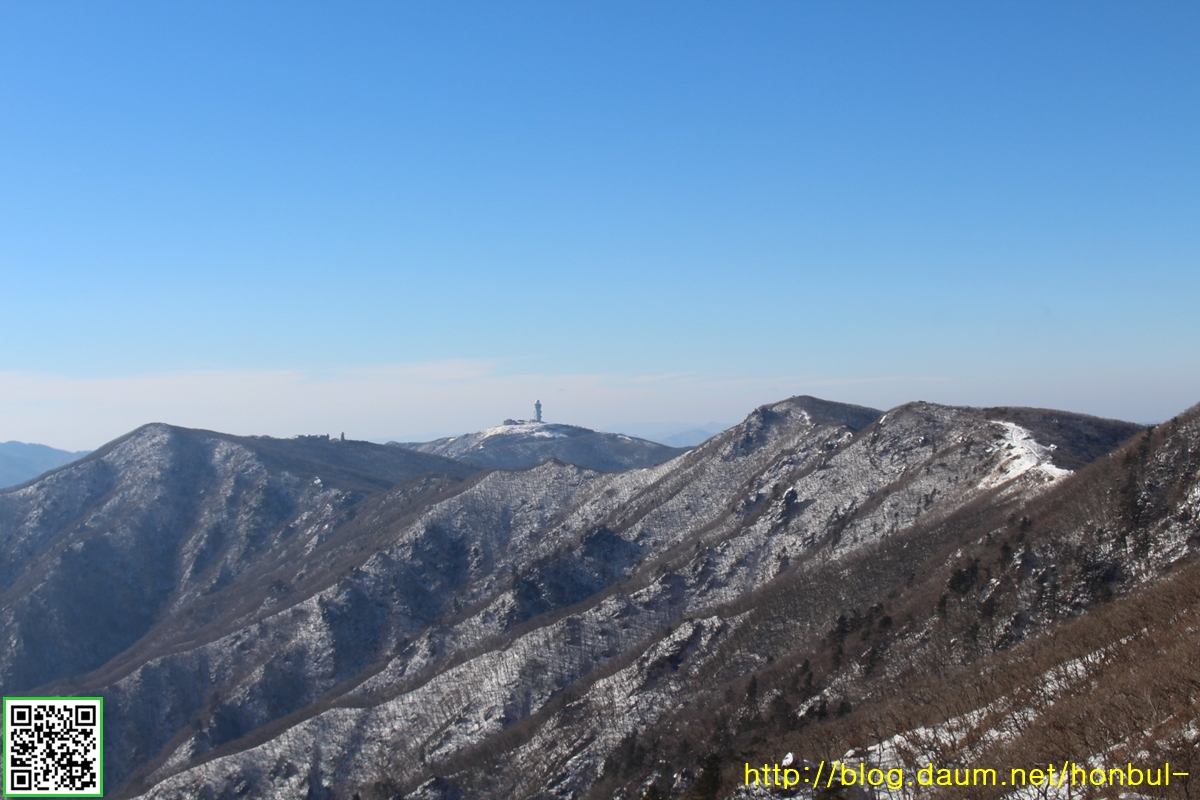 비로봉 방향의 이 능선엔 서리꽃이 하얗게 피어야 하는 데, 나뭇가지만 휑하게 드러냈다.