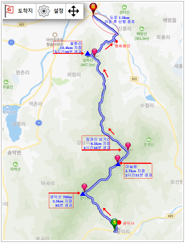 광덕산 고도 700m에 설화산 고도는 441m로 높지 않으나 연계하면 14km 전후 거리라 부담은 있다.