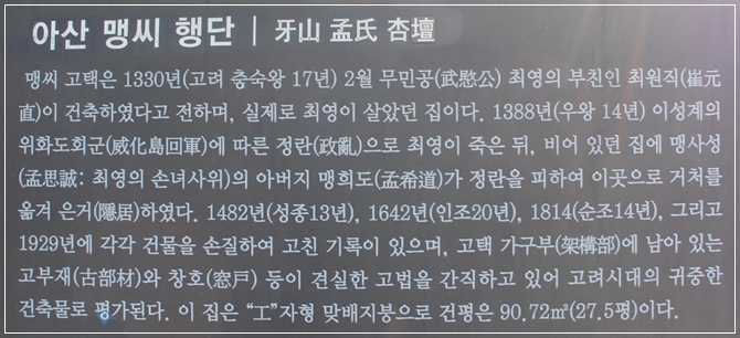 그 이후 맹사성 일가가 살던 옛집으로 고려시대 가옥의 구조를 잘 보여준다. (안내문)