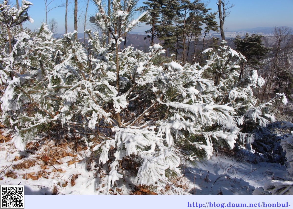키 작은 소나무에 바람이 쓸고 온 눈이 얹혀 제법 운치가 있다.