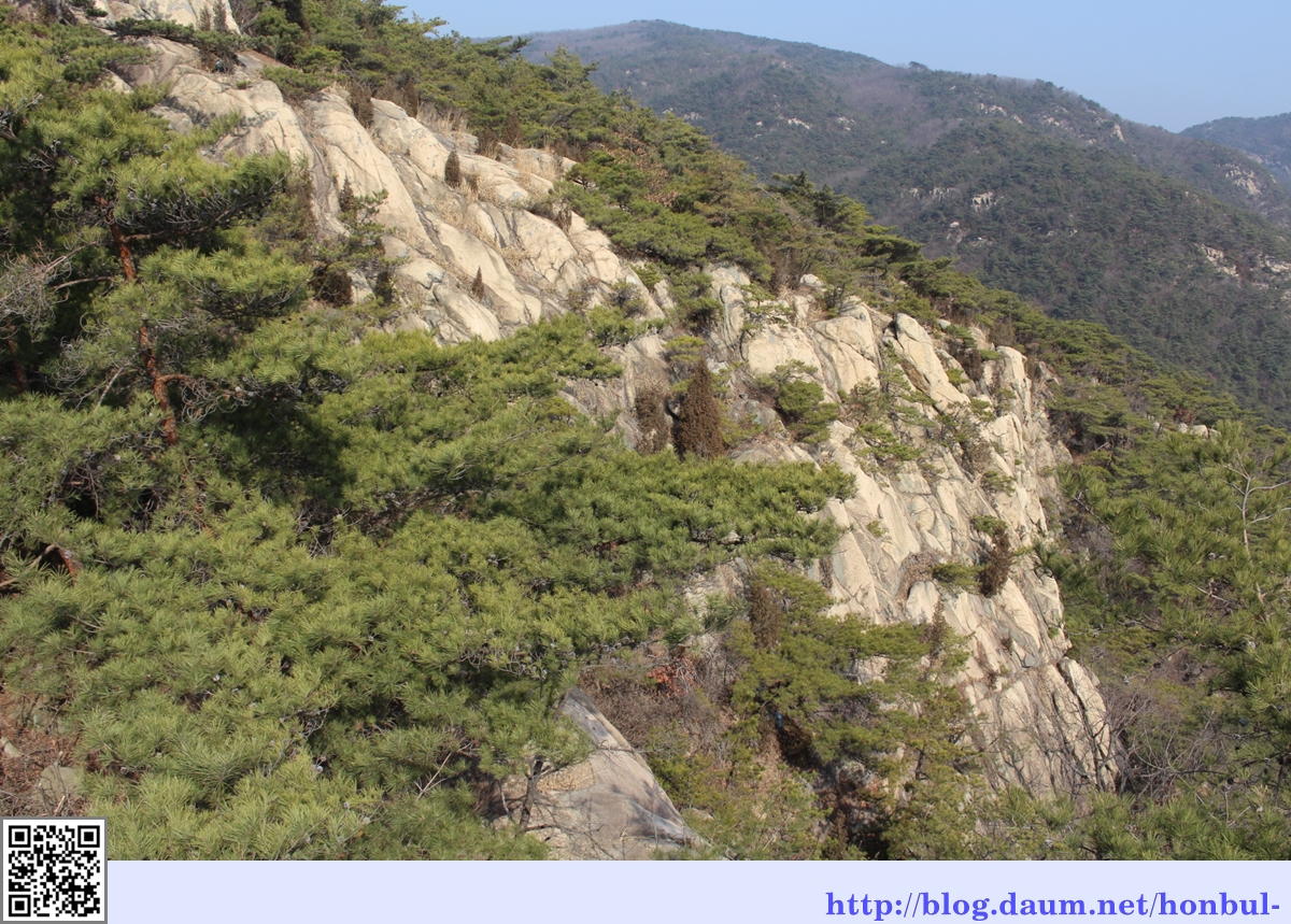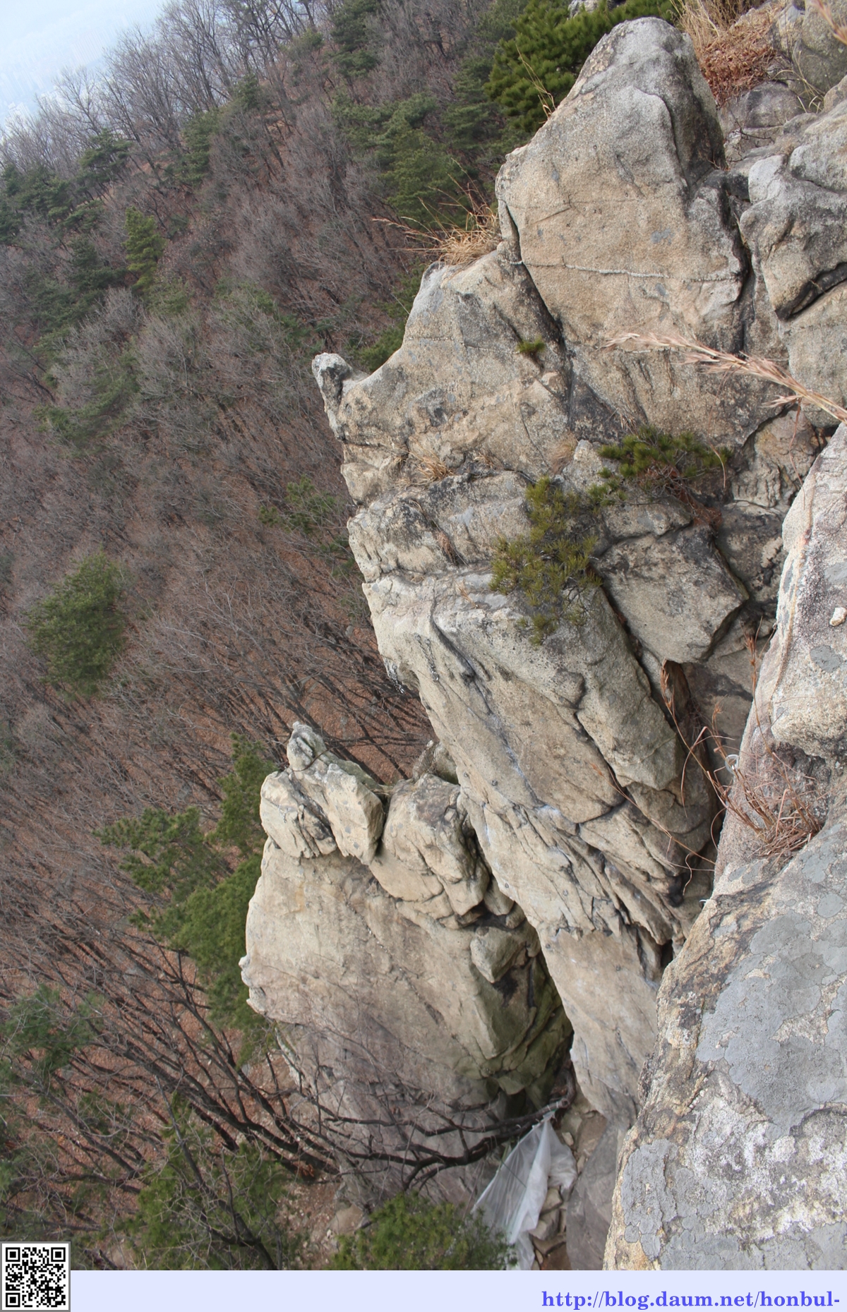 올라올 때 자 능선을 탔는데, 여기서 보니 바위 절벽이 제법 길다.