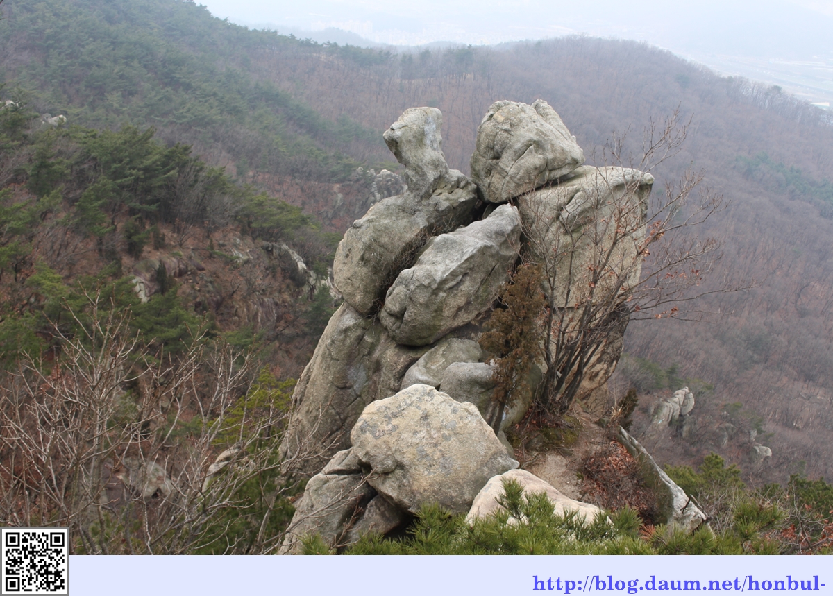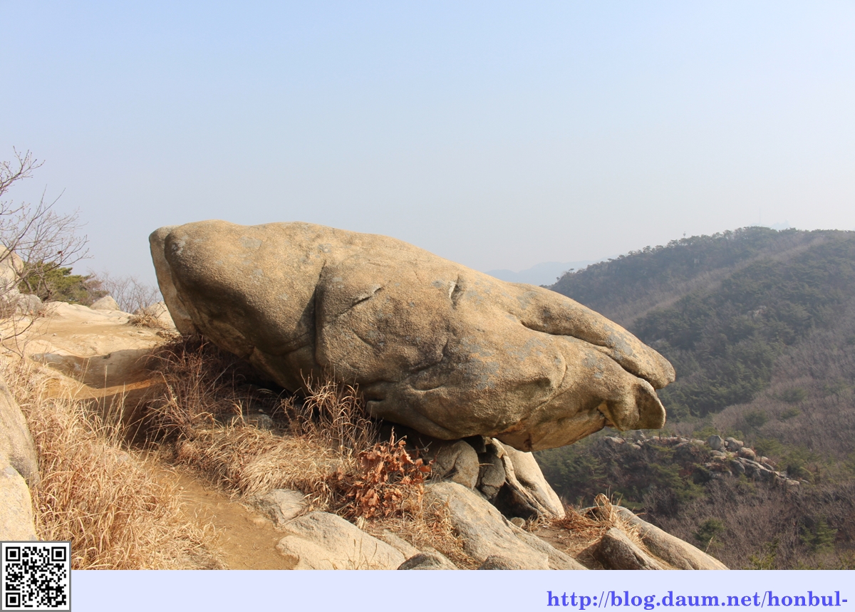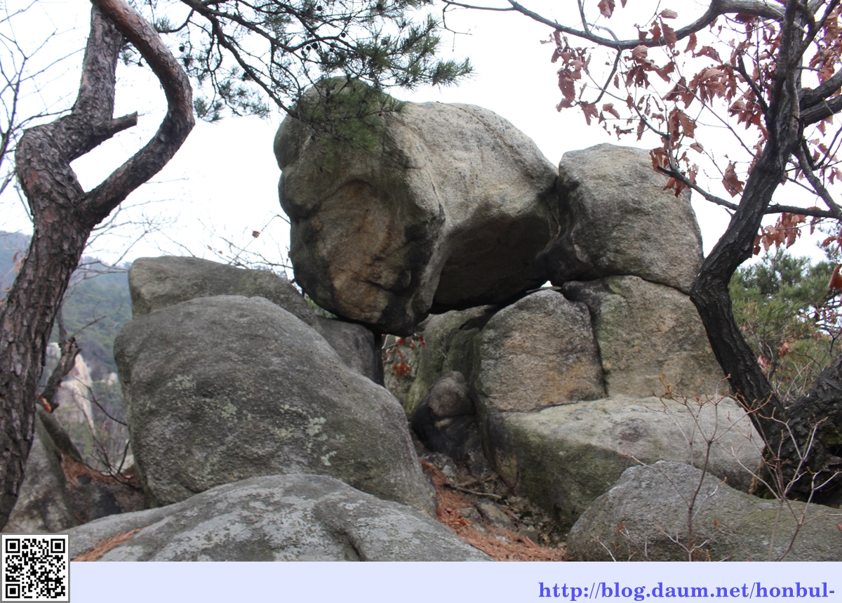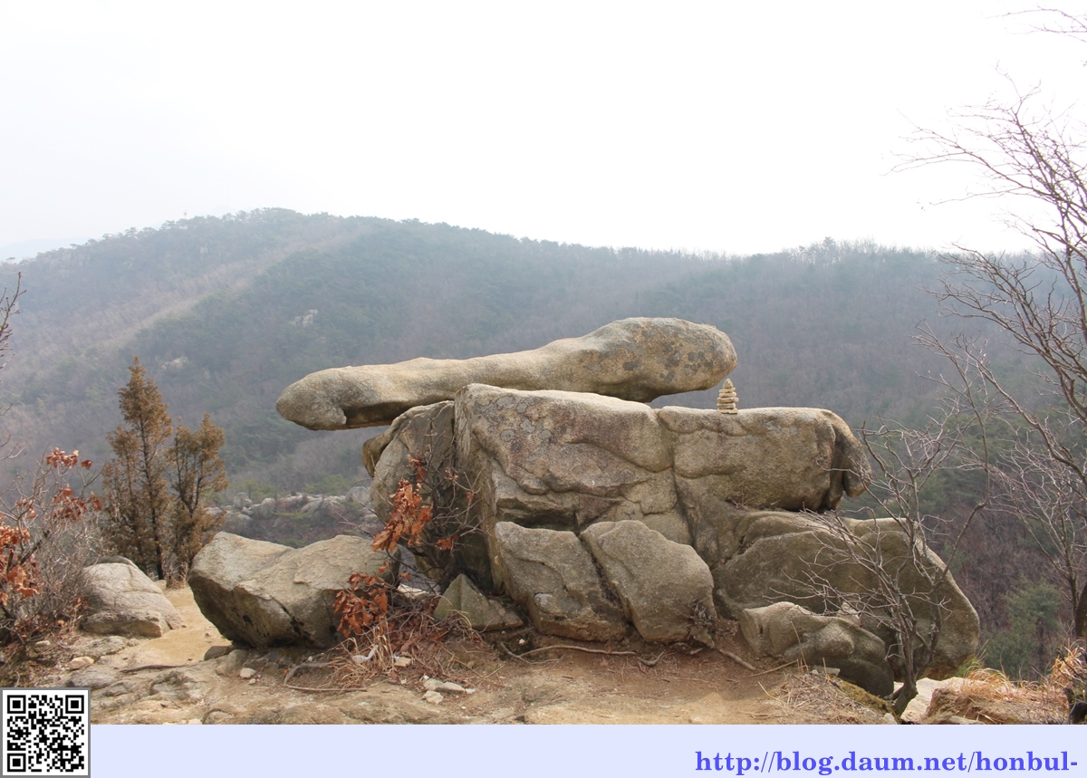 바위에 놓인 기다란 바위는 무슨 형상일까?