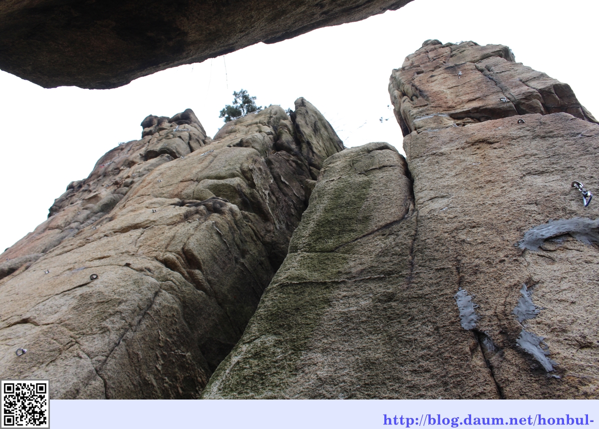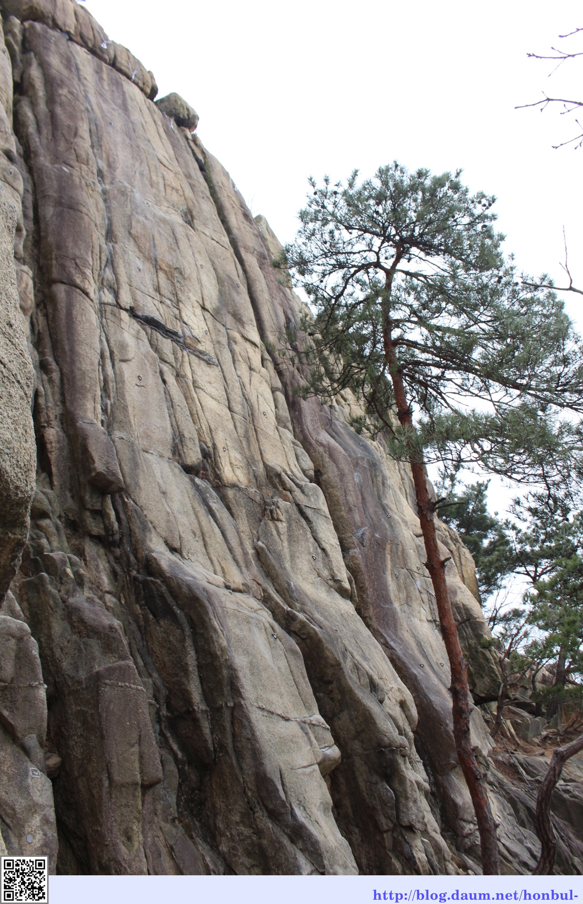 이 바위를 옆으로 돌아 올라갔으나 위쪽은 바위가 너무 높아 오를 수 없다.