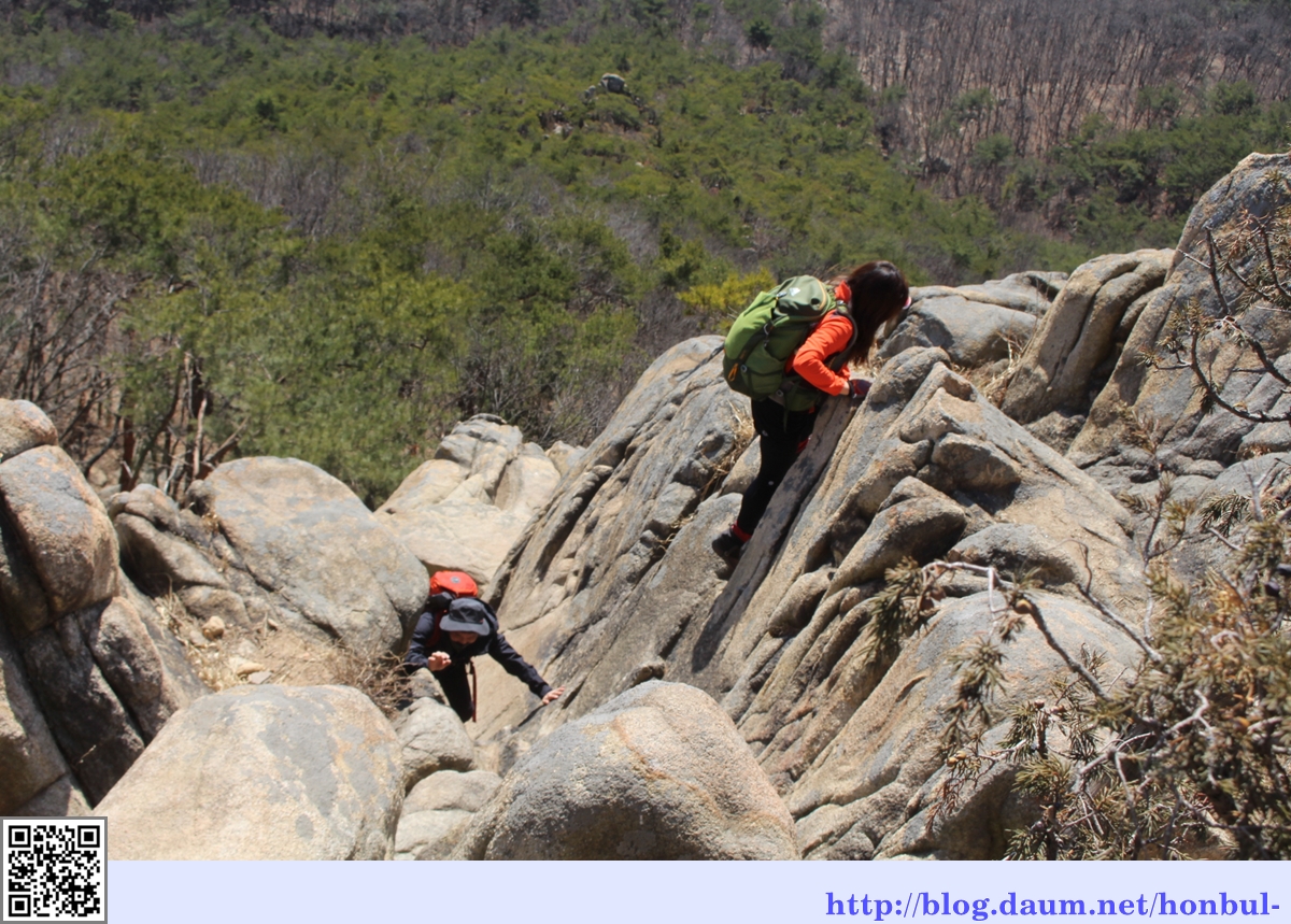 이 바위는 뒤로 올라가는 구간이 있기는 하나 좁은 틈을 비집고 올라가기엔 배낭에 걸린다.