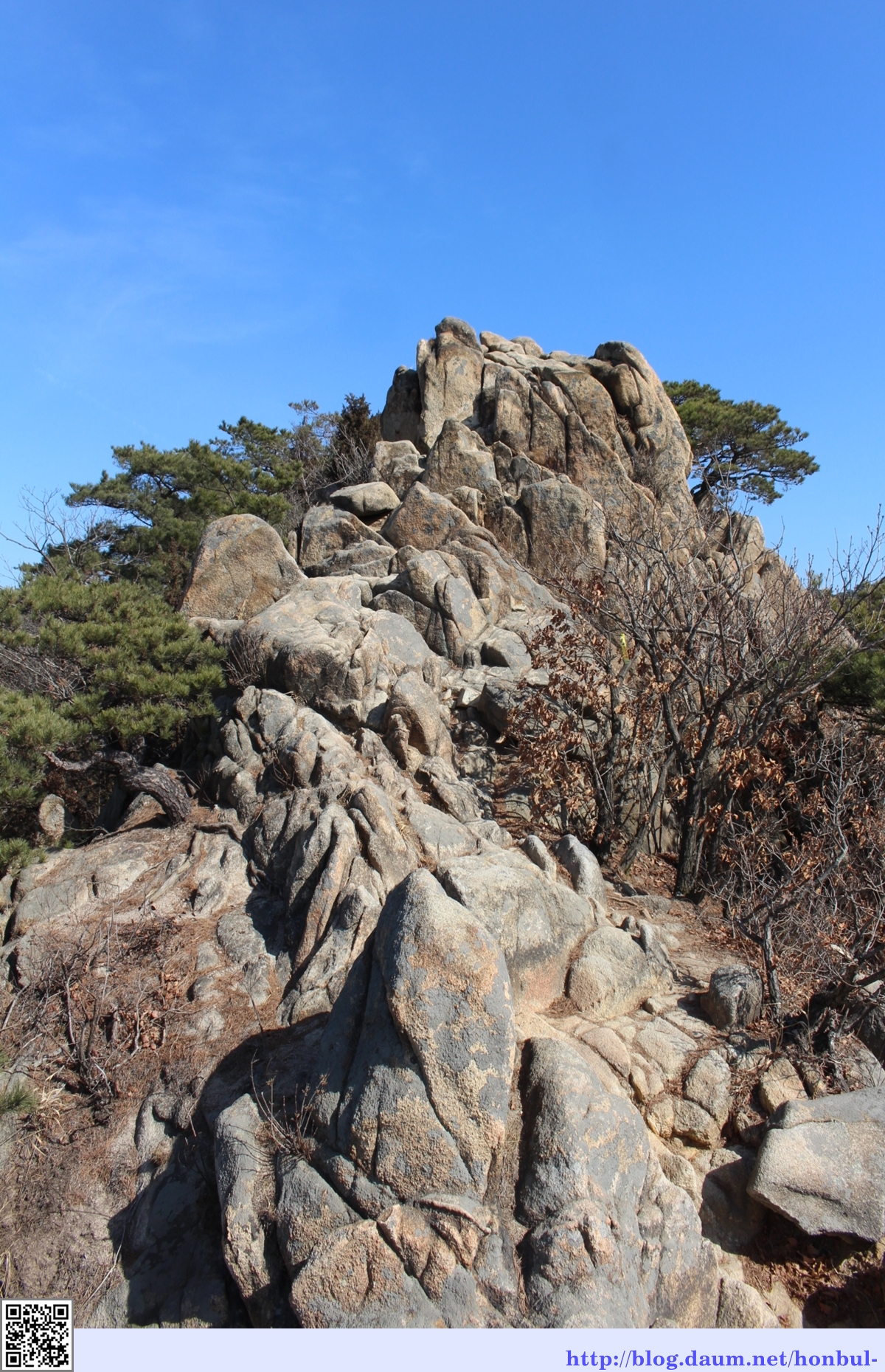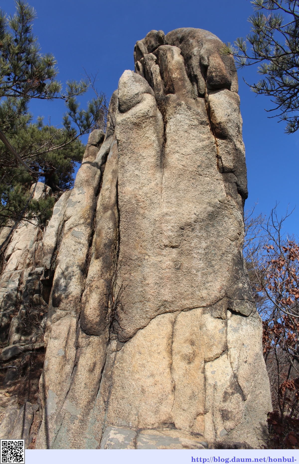 큰길로 다닐 때 이 바위는 앞에 뭉툭한 모습만 봤는데, 이번엔 샛길로 빠져 숲에서 보니 좀 더 다이내믹하다.