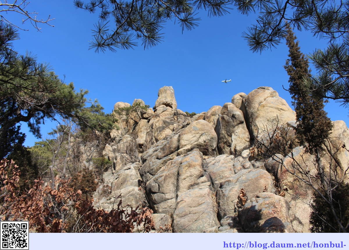 염불암을 나와 삼성산 국기봉으로 가며 만나는 바위 위로 여객기가 지나간다.