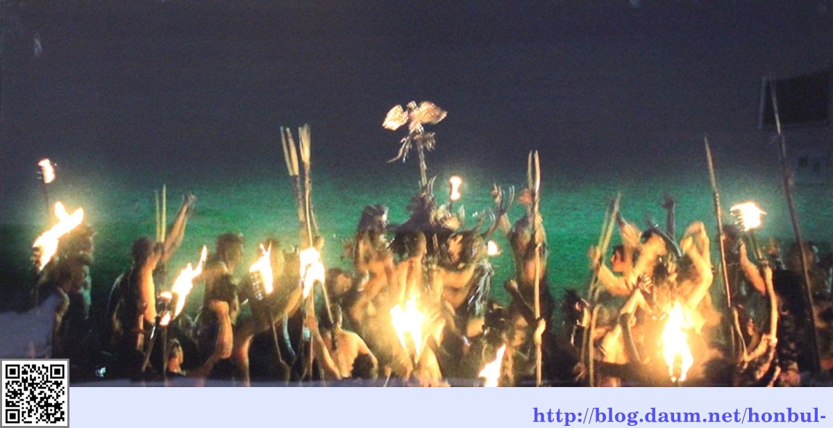 이때 가면을 쓴 족장이 독수리 기를 들고 나와 흥을 돋운다.