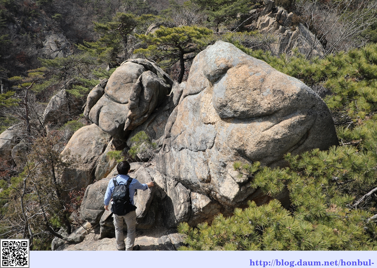 어느 바위인지 옆으로 돌아 오르려는데, 바위가 넓어 바위 밑 틈새로 겨우 빠져나왔다.