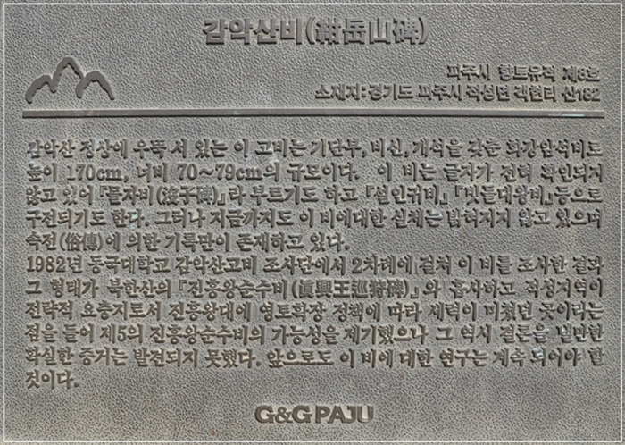 비석 앞 동판 안내문과 “감악산” 표지석은 파주시에서 설치해 파주시가 원천적 소유권을 주장하고 있으며,